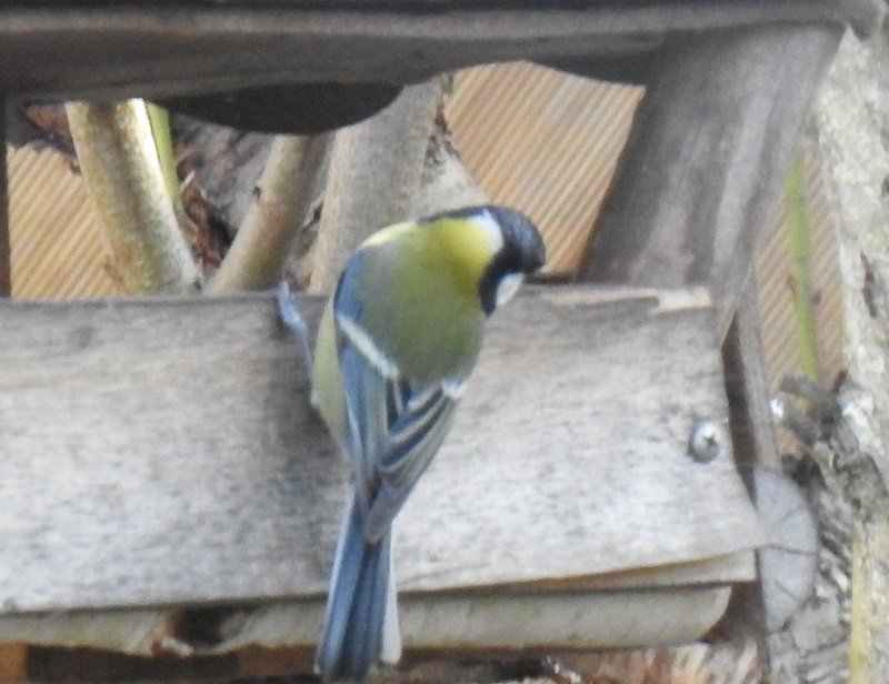 Jak widać, na spacerze nie udało mi się ufotopolować nic specjalnie ekscytującego, albo nawet pospolitego, ale w ładnym ujęciu. Dlatego, nieusatysfakcjonowany, wybrałem się potem jeszcze raz w bezpośrednie pobliże domu – i odkryłem u sąsiadów dwie posesje dalej ogrodowy karmnik, nawiedzany przez stado sikor i dzwońca, którego już na Wyspie prezentowałem. Dlatego tym razem niebrzydka (chociaż niestety nieostra – zdjęcia robiłem przez siatki, gałęzie etc.) sikora bogatka na brzegu karmnika.
