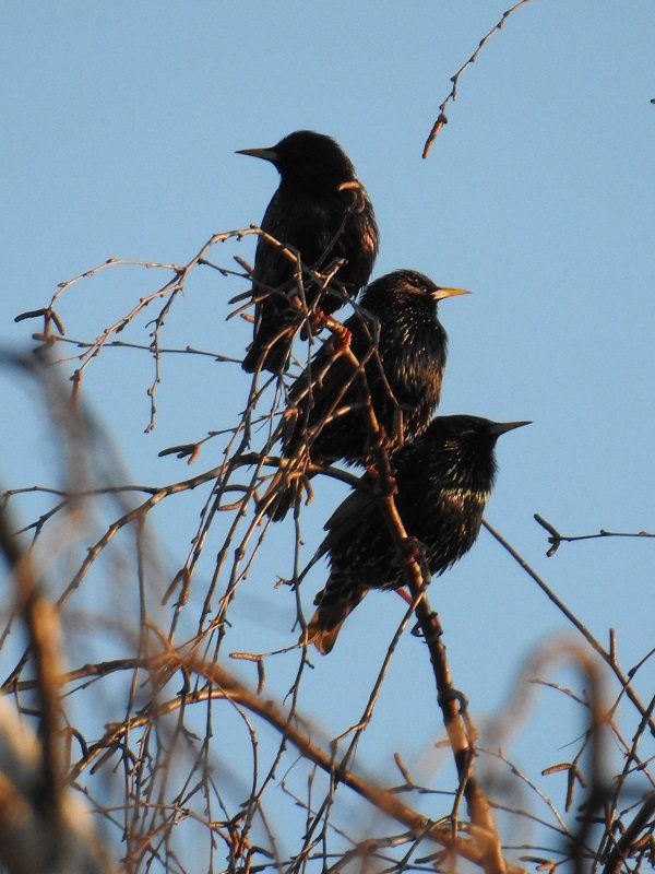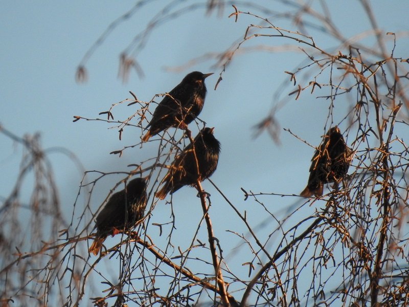 A potem udało mi się uchwycić bardzo fajną rzecz: na szczycie brzozy od frontu pojawiła się czwórka szpaków. Żałowałem tylko, że na zdjęciu nie słychać dźwięku, bo wyśpiewywały cudne trele (a nie pomyślałem, żeby nakręcić film; poza tym przy takim zbliżeniu z ręki obraz by tańczył). Ale samo zdjęcie też wygląda nieźle.