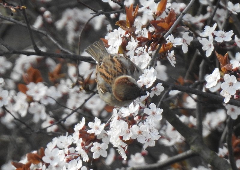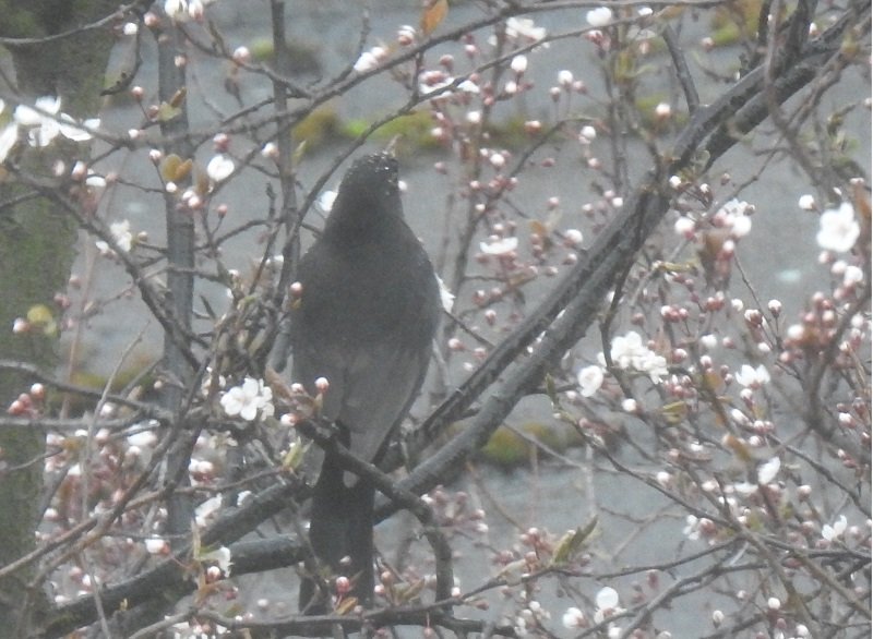 Jakoś zaraz potem skończyły się spacerki gdziekolwiek. Pozostał mi własny balkon albo okno, zwłaszcza kuchenne, bo z niego mam niezły widok na podwórko. No i właśnie jak zaczęła kwitnąć śliwa japońska (a może to jaki inny krzew? Kto się zna, niech poprawi!), to pogoda uznała, że czas poprószyć śniegiem (dlatego światło na zdjęciu niespecjalne). Nic dziwnego, że siedzący na krzaku kos zgłupiał. Białe albo różowe kwiatki, biały śnieg leci na głowę…