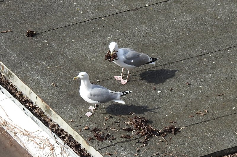 Na koniec na dach oficyny przyleciała para mew, które wydając niezwyczajne dla tego gatunku odgłosy (zapewne romantyczne) wzięły się za przygotowywanie do budowania gniazda na dachu oficyny w podwórzu. Miałem ambiwalentne odczucia: byłoby fajnie, gdyby je zbudowały, bo miałbym w zasięgu obiektywu gniazdo i mógłbym dokumentować wysiadywanie, wykluwanie, karmienie etc., ale z drugiej strony dach oficyny jest stosunkowo nisko i całkowicie w zasięgu okolicznych kotów wolnobytujących. Dlatego w sumie odetchnąłem z ulgą, kiedy mewy zrezygnowały z pomysłu i wyniosły się gdzie indziej. Zostało tylko zdjęcie.