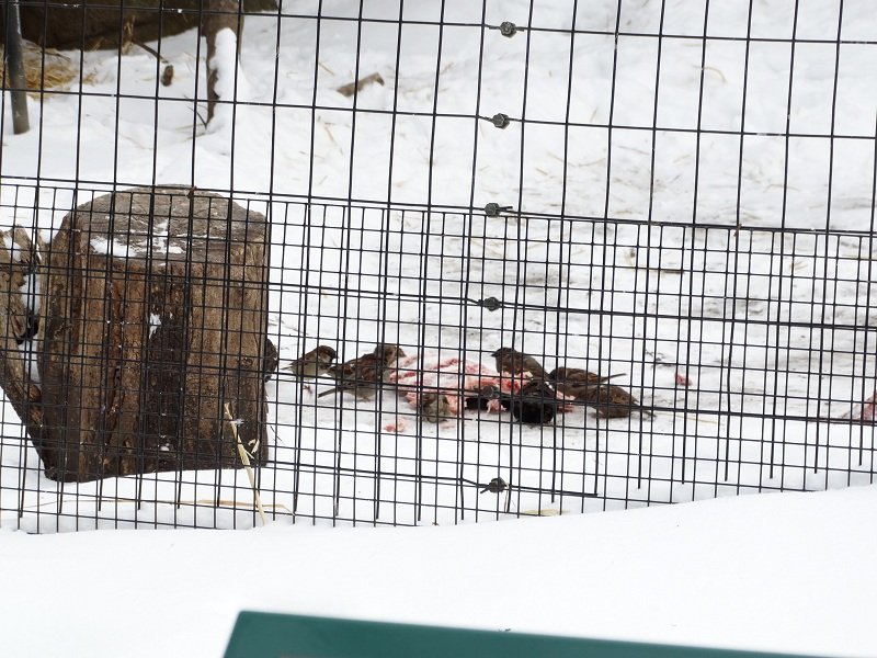 Wychodząc z ptasiego pawilonu aż przetarłam oczy ze zdumienia. W czasie naszego pobytu w budynku obsługa nakarmiła sępy. Na ziemi leżały jakieś żebra z mięskiem, a na nich… ucztowało stadko wróbli!!! Sępy jakoś tego nie brały do głowy i nie zwracały na wróbelki uwagi. Widocznie nie były głodne…