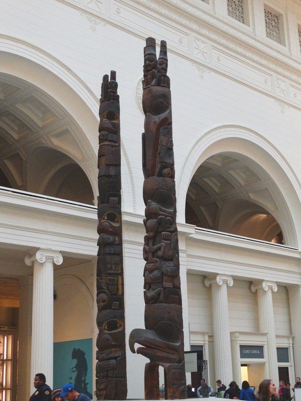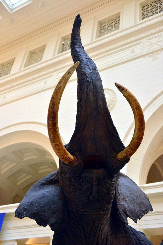 Już w holu głównym wyglądało ciekawie. W oczy rzucały się trzy rzeczy. Dwa ogromne totemy (zaraz za kasami), trochę dalej dwa wielkie, walczące słonie i ogromny szkielet jakiegoś przedpotopowego stwora. Po przejściu przez kasy (dostaliśmy darmowe bilety), obejrzeliśmy słonie (oczywiście tam poleciałam najpierw). Na tabliczce informacyjnej wyczytałam, że są to prawdziwe słonie, tyle że wypchane. Trafiły do muzeum w 1909 roku i chociaż muzeum zmieniło lokalizację w 1921 roku, to słonie zostały przewiezione i nadal należą do najciekawszych eksponatów. Nie od razu zrozumiałam co znaczy „the taxidermy process”. Dopiero w domu sprawdziłam w słowniku. Były to pierwsze na świecie słonie poddane temu procesowi. Muszę przyznać, że zaskoczyło mnie to. Do tej pory myślałam, że wypycha się ptaki, albo trofea myśliwskie. Ale słonie?!!!