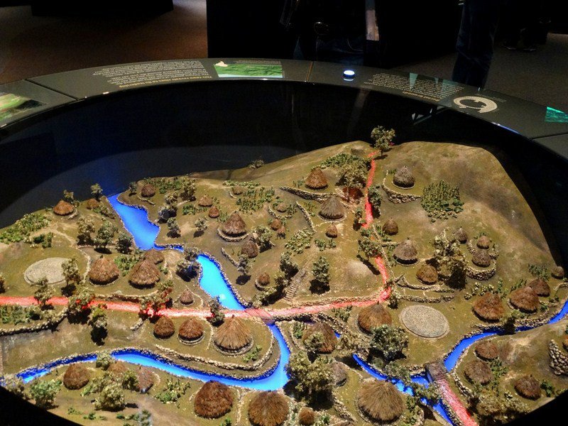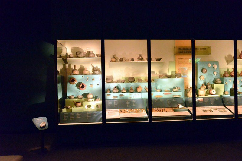Podobała mi się plansza z wioską takich Mississippian. Okrągła, a z czterech stron – cztery przyciski. Oczywiście pociskałam wszystkie, czytając przy okazji co one oznaczają. Pierwszy zapalał na czerwono kamienną drogę idącą przez wieś, a na niebiesko system wodno-kanalizacyjny. Drugi zapalał okrągłe chatynki – spiżarnie. Było ich trochę pomiędzy mieszkalnymi domami (chociaż i spiżarnie i chatynki były do siebie bardzo podobne). Trzeci przycisk zapalał dwie „platformy imprezowe”. Jak napisali w informacji przy guziku, na tych platformach odbywały się plemienne uczty, wspólne tańce i zabawy. I czwarty przycisk zapalał miejsca pochówku… Co najśmieszniejsze, były to te dwie „platformy imprezowe” i kilka miejsc dokoła wioski… Było też wyjaśnienie, że według naukowców, pod tymi kamiennymi platformami, prawdopodobnie pochowani zostali jacyś ważniejsi mieszkańcy. Może władcy, może wybitni wojownicy, a może bogatsi… I tak sobie pomyślałam o dzisiejszych czasach, kto by chciał urządzać zabawy taneczne na cmentarzu… nawet gdyby się tańczyło obok grobów, a nie na…