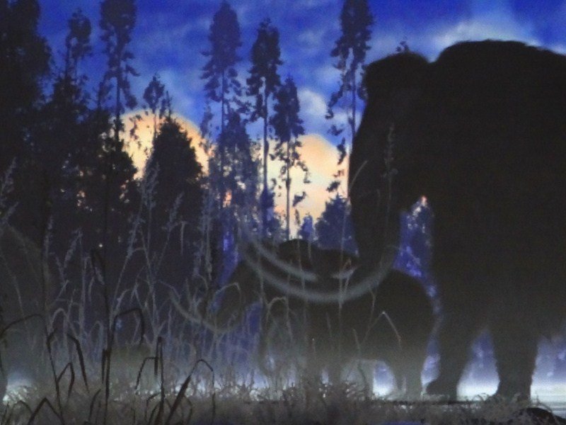 Niewielki, ciemny korytarzyk z gablotą w ścianie… jakieś figurki… Za załomem na dwóch ścianach idące mamuty. Jedne przechodziły bokiem, inne szły prosto na nas i jakby w ostatniej chwili skręcały… Szły wolno, majestatycznie… A że dokoła było ciemno i tylko ta niebieska poświata ze ściennych ekranów, wrażenie było super… te mamuty wydawały się takie realne…