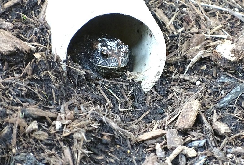 Jako pierwsza, czarna żaba. Gdyby się nie ruszała, nie zauważyłabym jej. Idealnie zlewała się z podłożem. Uciekła mi do tej rury, ale gdy wróciłam w to miejsce jeszcze raz, siedziała (że tak powiem) na progu Wink I nawet trochę ją widać…