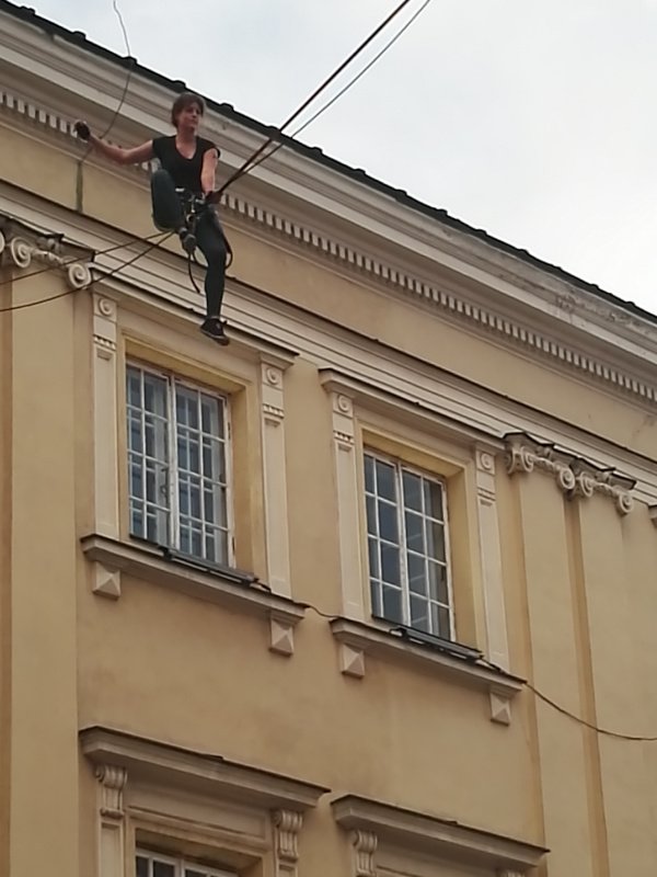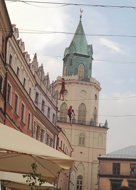 Plątaliśmy się po mieście pod czujnym okiem gospodarzy, i prawie w każdym miejscu coś się działo: jak nie muzyka, to gość skręcający stworki z baloników, ktoś „łykający ogień”, na dziedzińcu klasztornym występował slapstickowy duet klaunów, stylizowanych na Chaplina i Giuliettę Masinę, jeśli się na kogoś nie weszło bezpośrednio to nawet nie było w tłumie widać, co się minęło! Za to z daleka widoczni byli linoskoczkowie. Na poziomie drugiego piętra za otwartymi oknami zamontowano solidne belki i między tymi belkami rozciągnięto liny. Było tych lin dużo, istna pajęczyna nad Rynkiem. Po większości z nich próbowali chodzić ludzie zabezpieczani linką przypiętą do uprzęży, jedynie pod jedną czy dwoma była rozpięta siatka, i tam utrata równowagi skutkowała lądowaniem w tejże. Prawdę mówiąc, nie widziałem ani jednego przejścia całej liny bez wywrotki – faktem jest, że dystanse były długie i pokonywane bez pomocnych w utrzymaniu równowagi tyczek, a liny dość elastyczne… Nie jest to jednak przygana – sam nie odważyłbym się wyjść na taką linę, nie mówiąc już o przejściu choćby dwóch metrów 😉