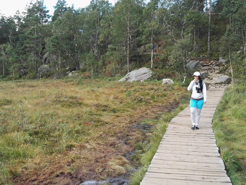 Jedyną komplikacją było to, że zamiast podpłynąć blisko Jørpeland i tam wsiąść w autobus, wykonaliśmy bardziej złożony dojazd: autobusem do centrum Stavanger, promem do Tau, i stąd autobusem na początek szlaku. Na szczęście wystartowaliśmy dość wcześnie rano, więc w górach jeszcze nie było tłumów. Gdy wracaliśmy, trzeba już było miejscami obok ścieżki, bo wchodzący zajmowali całą jej szerokość.