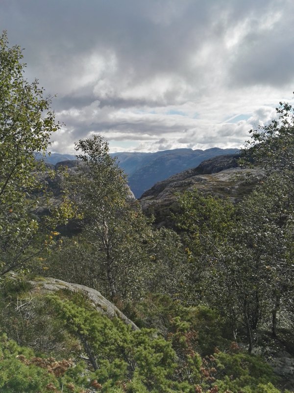 Jedyną komplikacją było to, że zamiast podpłynąć blisko Jørpeland i tam wsiąść w autobus, wykonaliśmy bardziej złożony dojazd: autobusem do centrum Stavanger, promem do Tau, i stąd autobusem na początek szlaku. Na szczęście wystartowaliśmy dość wcześnie rano, więc w górach jeszcze nie było tłumów. Gdy wracaliśmy, trzeba już było miejscami obok ścieżki, bo wchodzący zajmowali całą jej szerokość.
