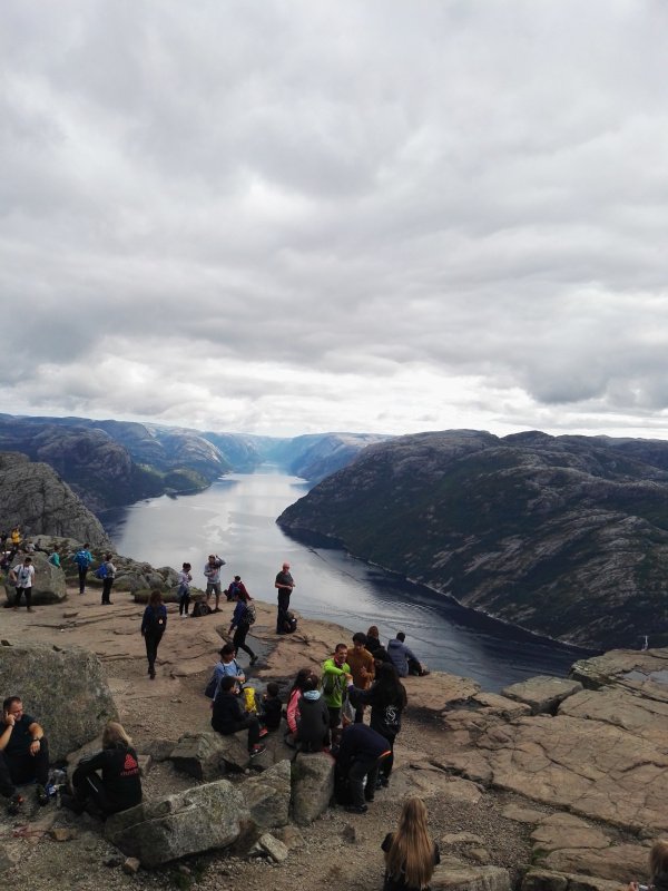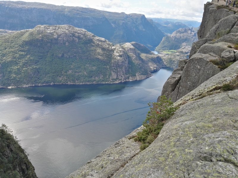 Już w pierwotnym planie mieliśmy jednodniową wycieczkę w góry. Nad najdłuższym ponoć fjordem Norwegii Lysefjord w jednej trzeciej długości góruje ogromna skała o zupełnie płaskim wierzchołku. Owa „Półka skalna”, zwana „Pulpit Rock” (a po tutejszemu Preikestolen) jest atrakcją na miarę naszego Giewontu czy Morskiego Oka. W pogodne dni walą tam tłumy turystów. Są nawet organizowane wycieczki (także z Polski): lot do Stavanger, podwiezienie do szlaku, marsz na półkę i powrót tą samą drogą do domu…