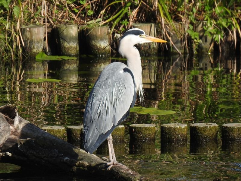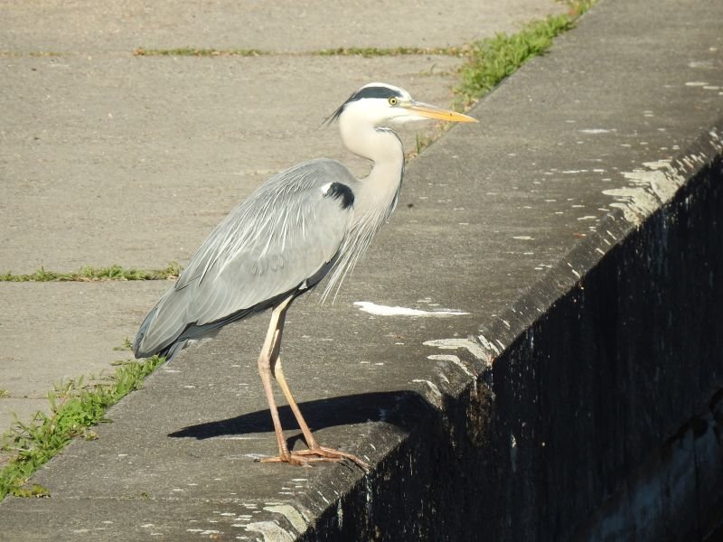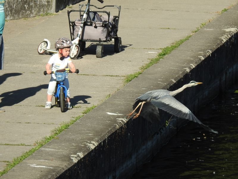 Czaple – jak widać na zdjęciu z dzieckiem – już w ogóle coraz mniej się boją ludzi, przynajmniej tam. Czapla na zdjęciu z podpisem „na betonowym nabrzeżu” pozwoliła do siebie podejść na jakieś 5 metrów, a ta druga, którą w końcu spłoszyło dziecko na rowerku, jak widać jeszcze bliżej. Dla mnie to też pewna nowość, pamiętam czaplę na Krutyni, która uciekała przez kajakiem, którym płynęliśmy z kolegą, z dużo większej odległości.