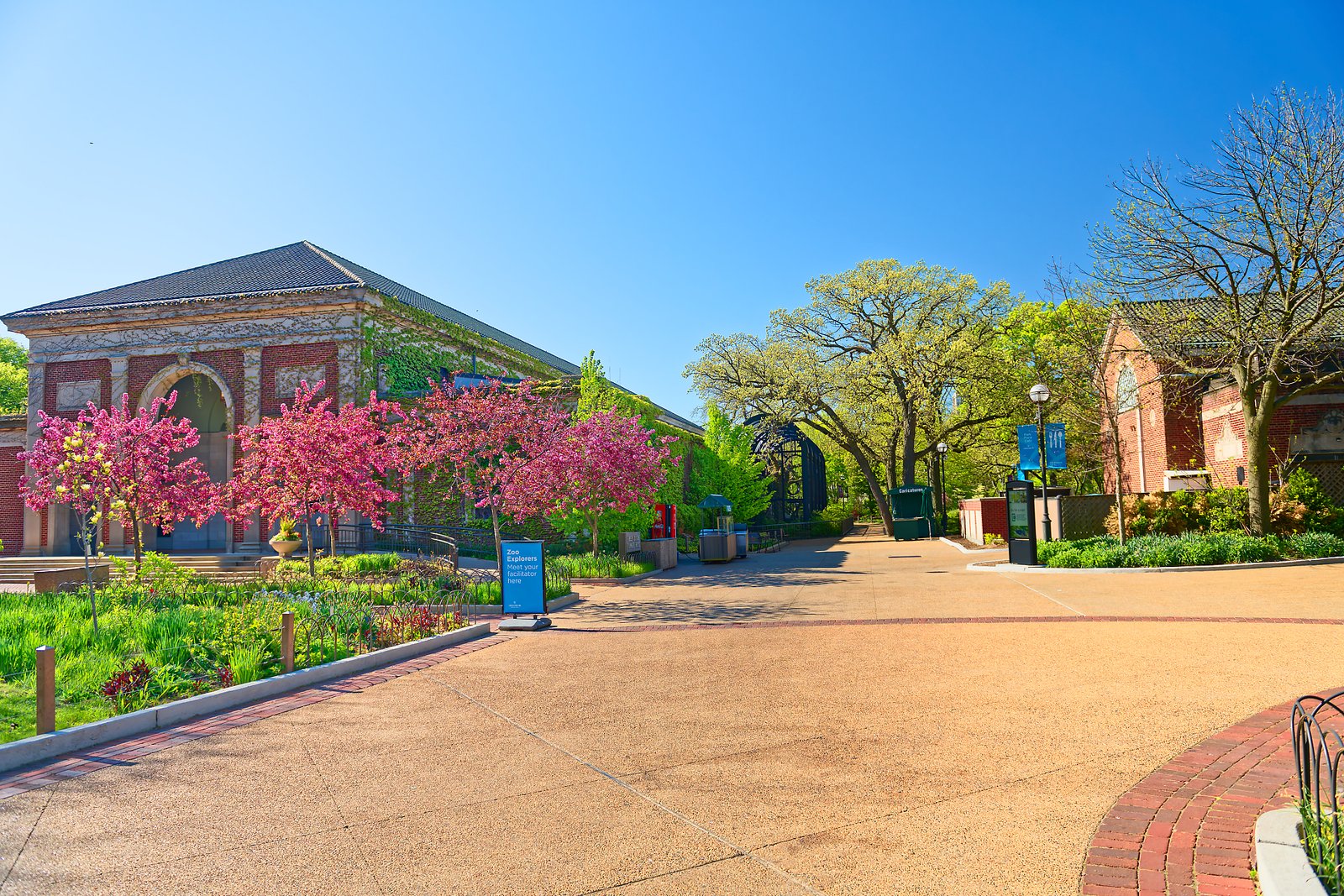 Piękne wejście do zoo, jeżeli mowa o robieniu dobrego pierwszego wrażenia, to te drzewka z różowym kwieciem działają, jak trzeba, ale i kompozycja całości wygląda zachęcająco.
