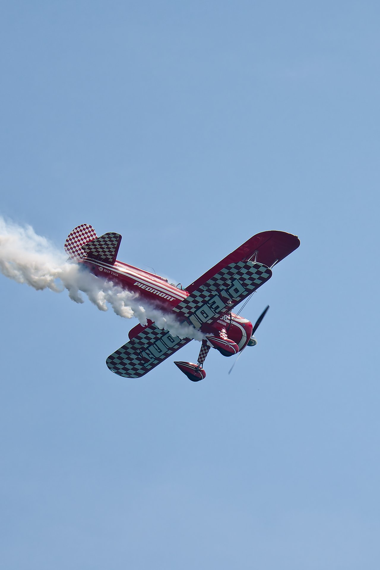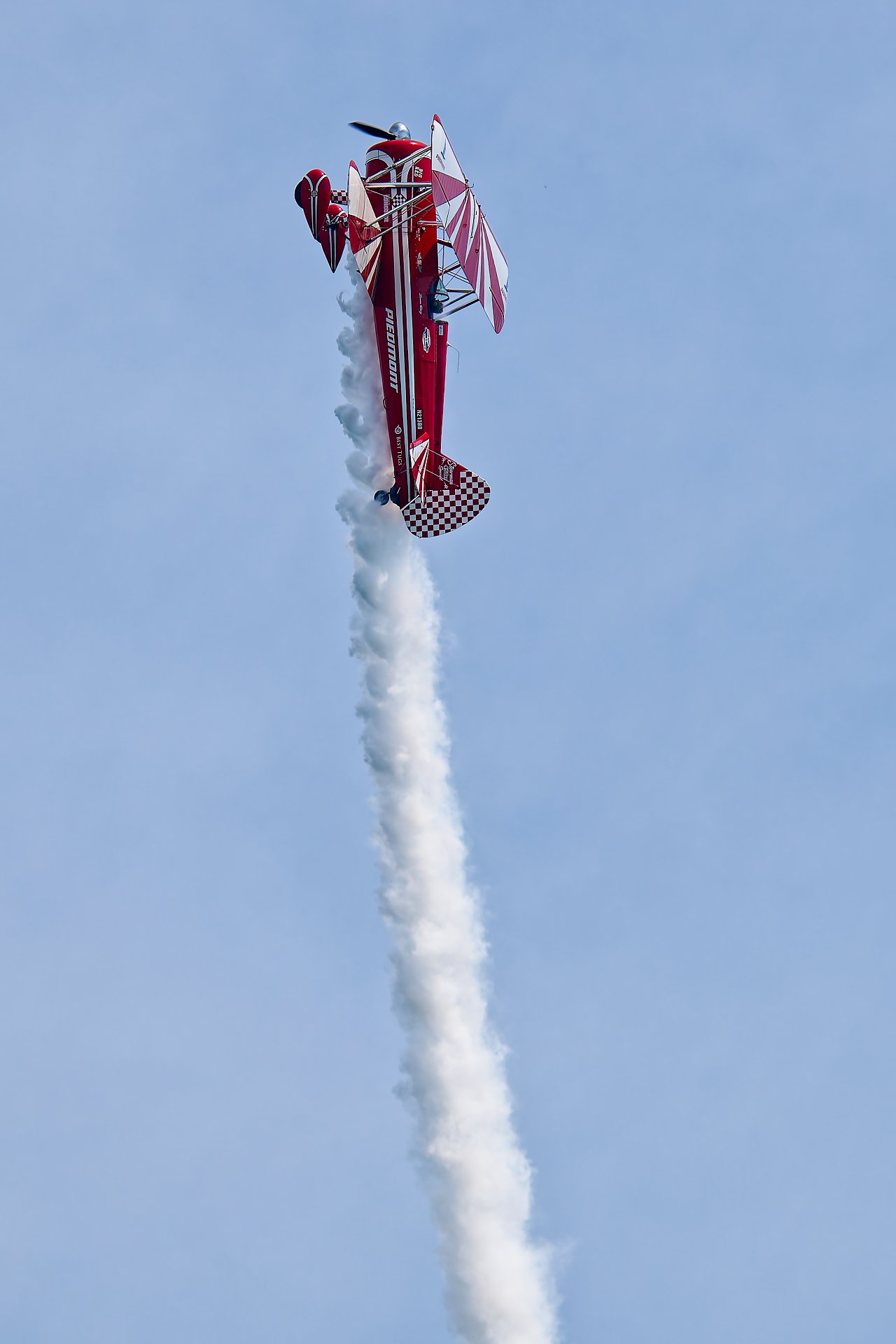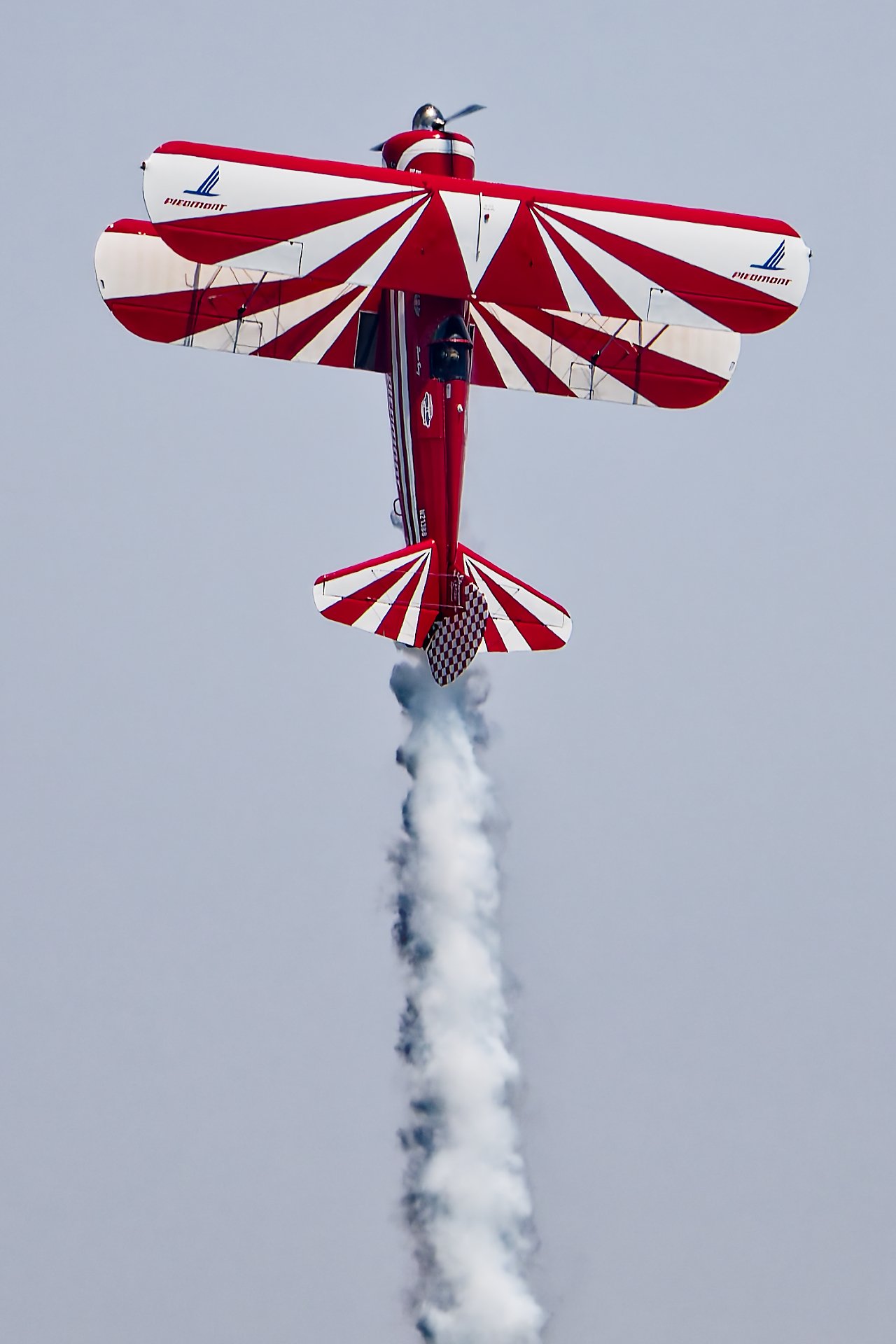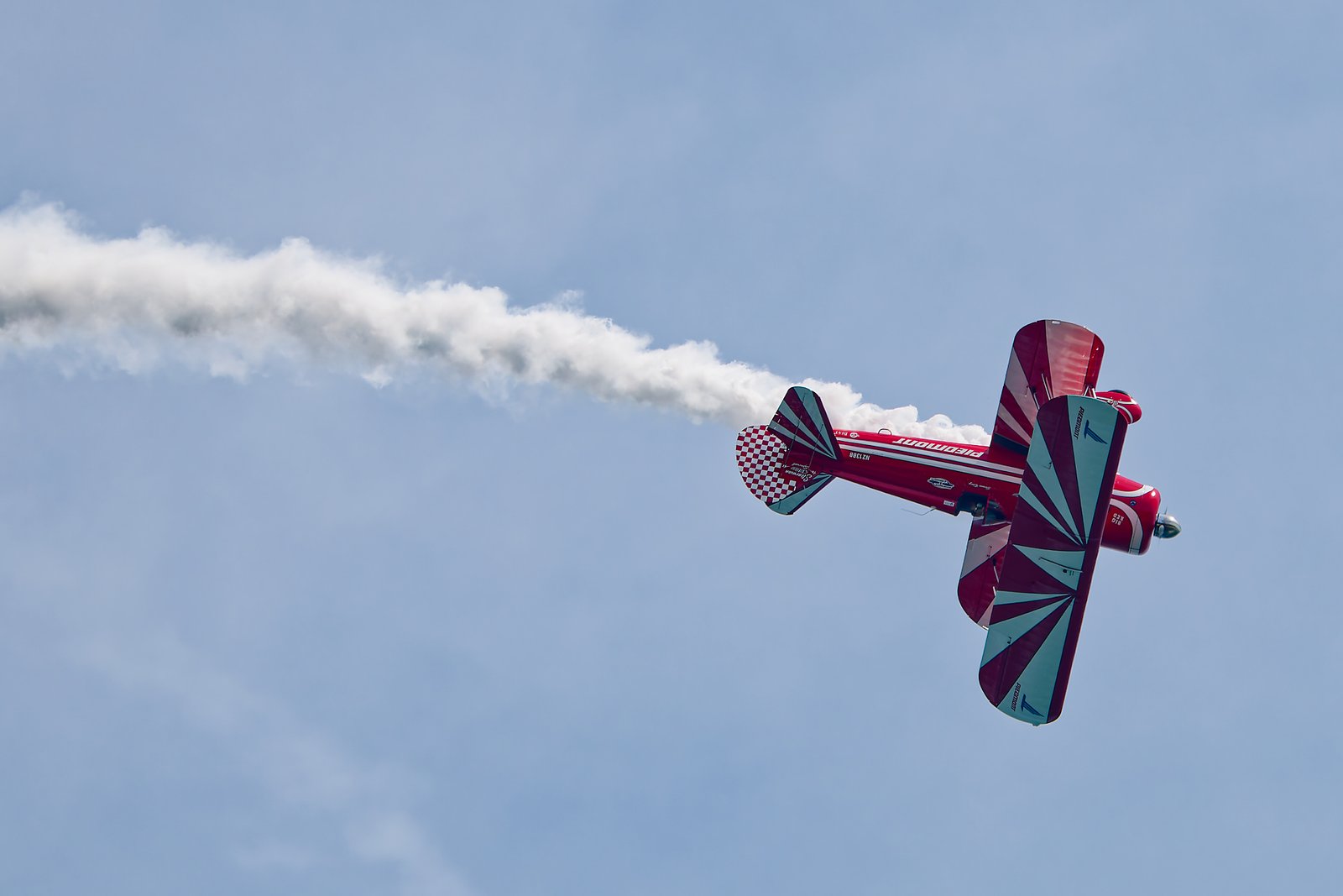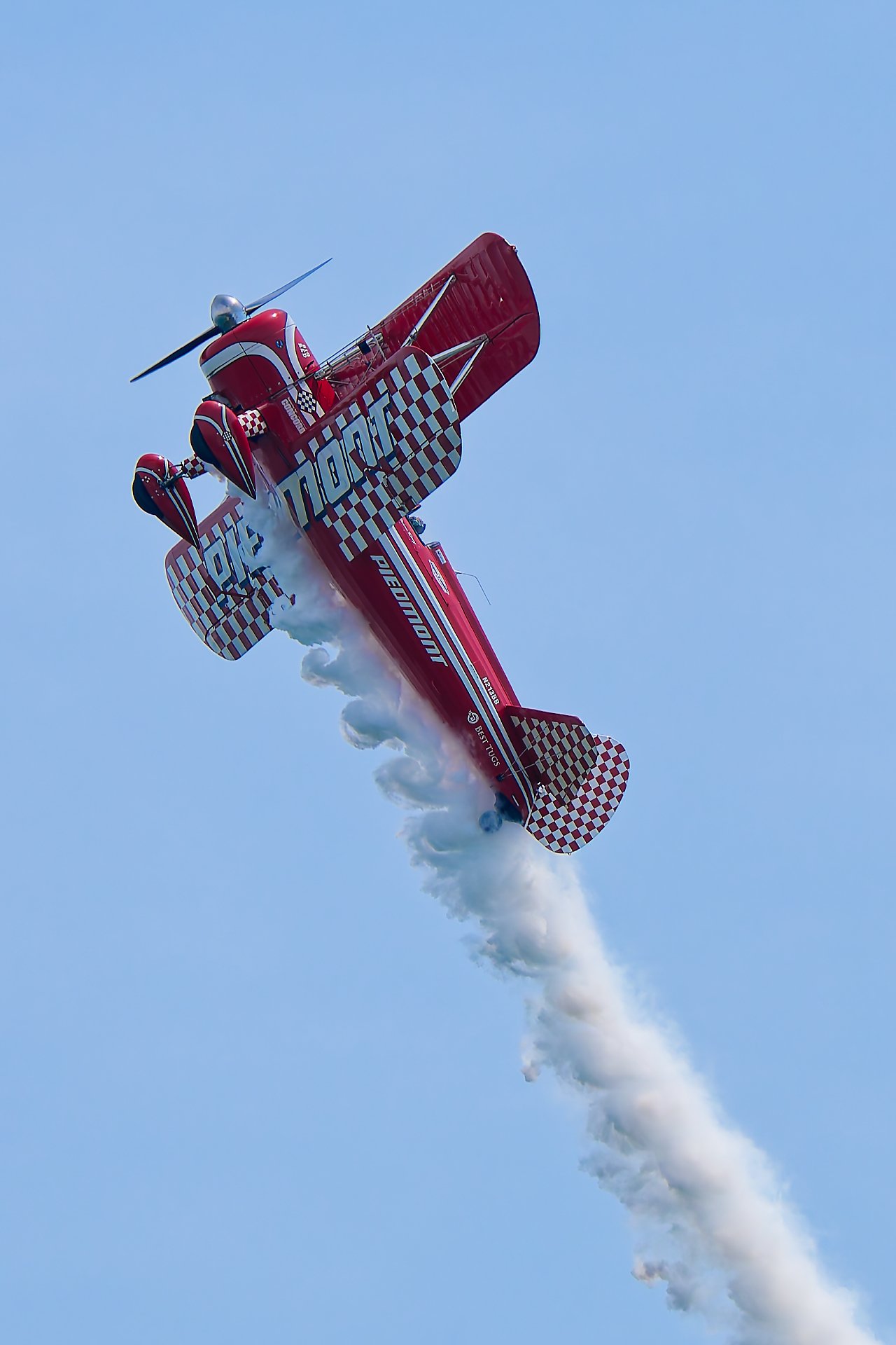 Czerwono-granatowy akrobata to Aviat Pitts S-2C, licencyjny wariant Curtissa Pitts S-2. Tu więcej informacji https://pl.wikipedia.org/wiki/Pitts_Special Fantastyczne zdjęcia, podczas tych figur pilot musi znosić niewąskie przeciążenia.