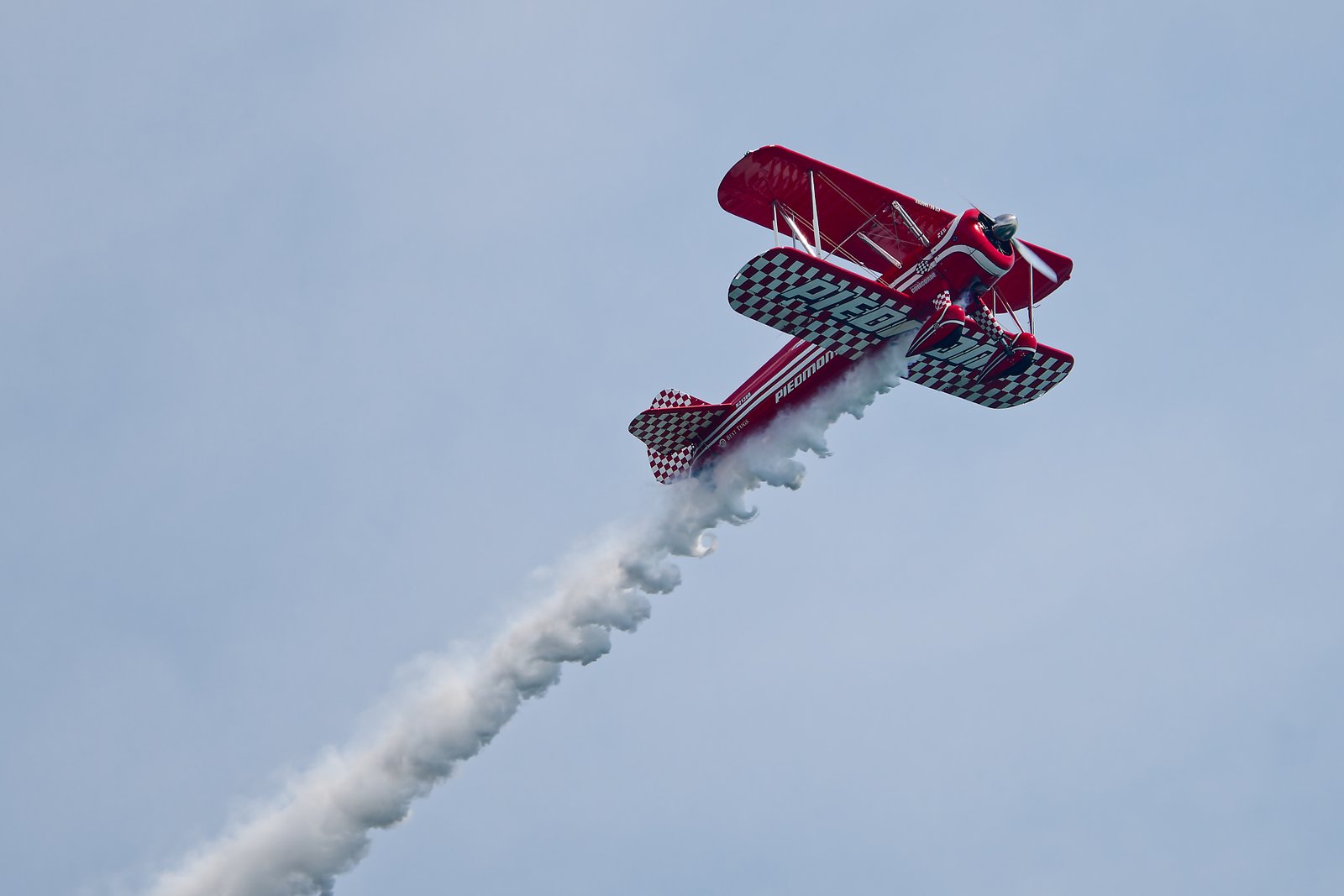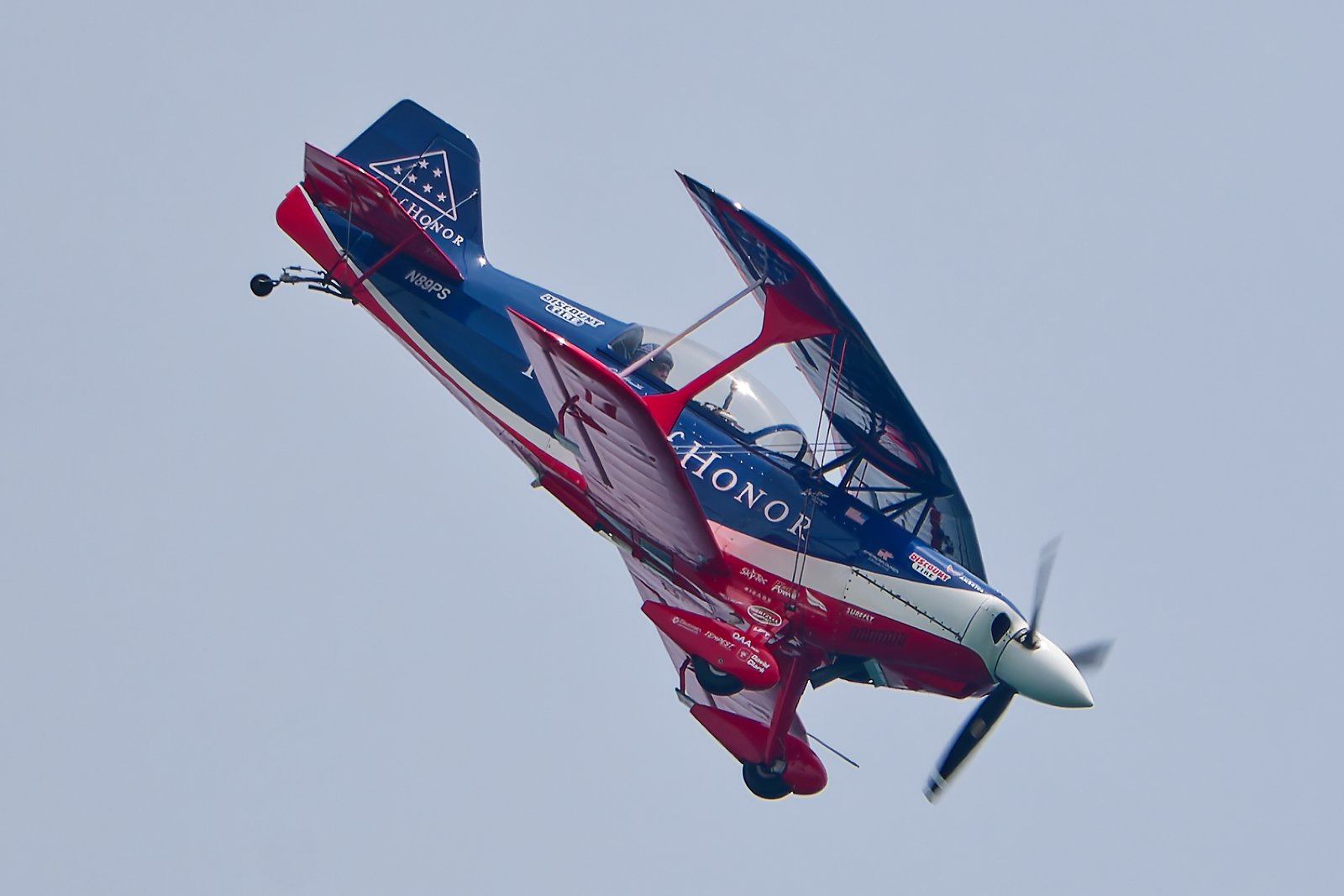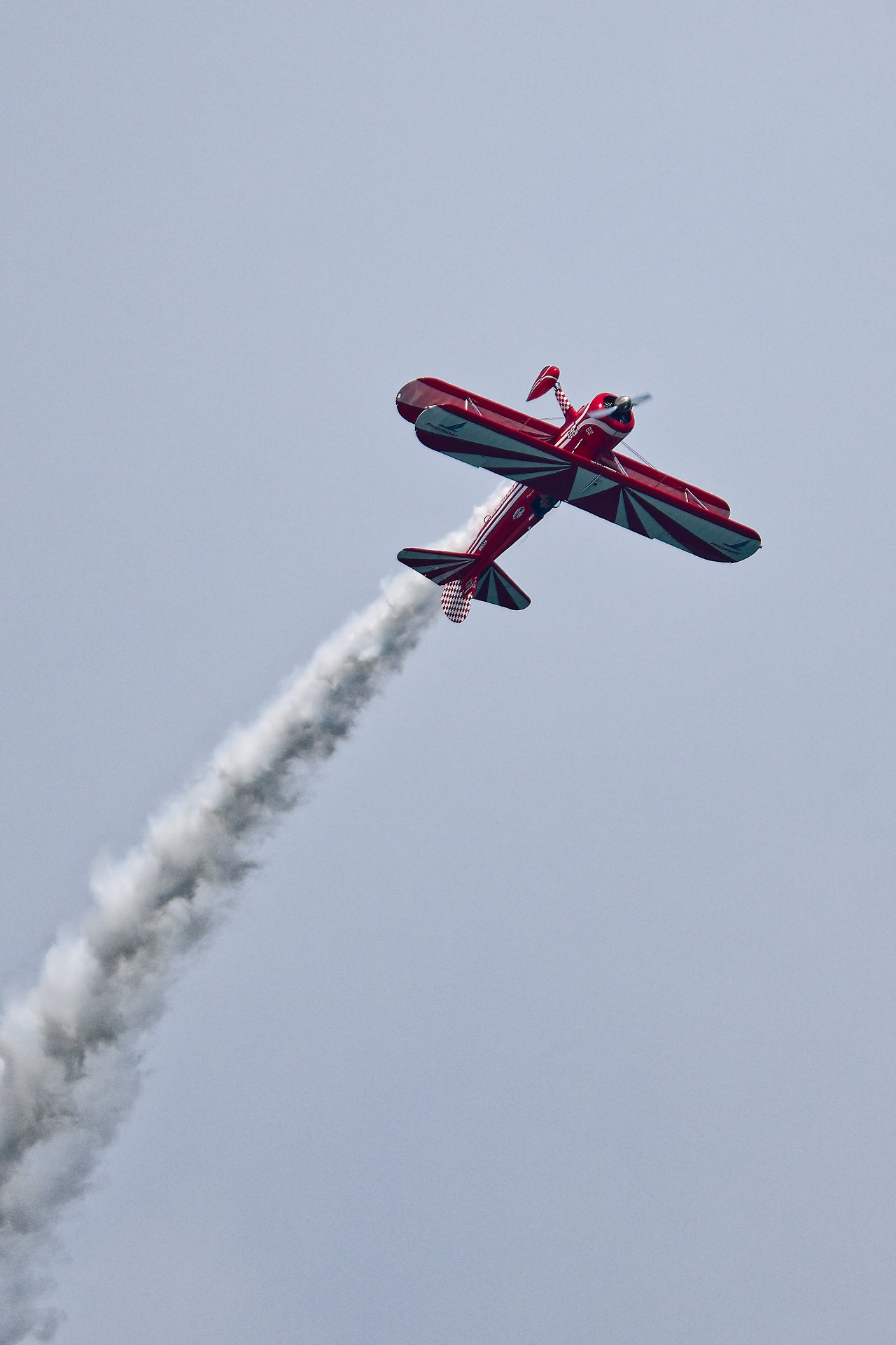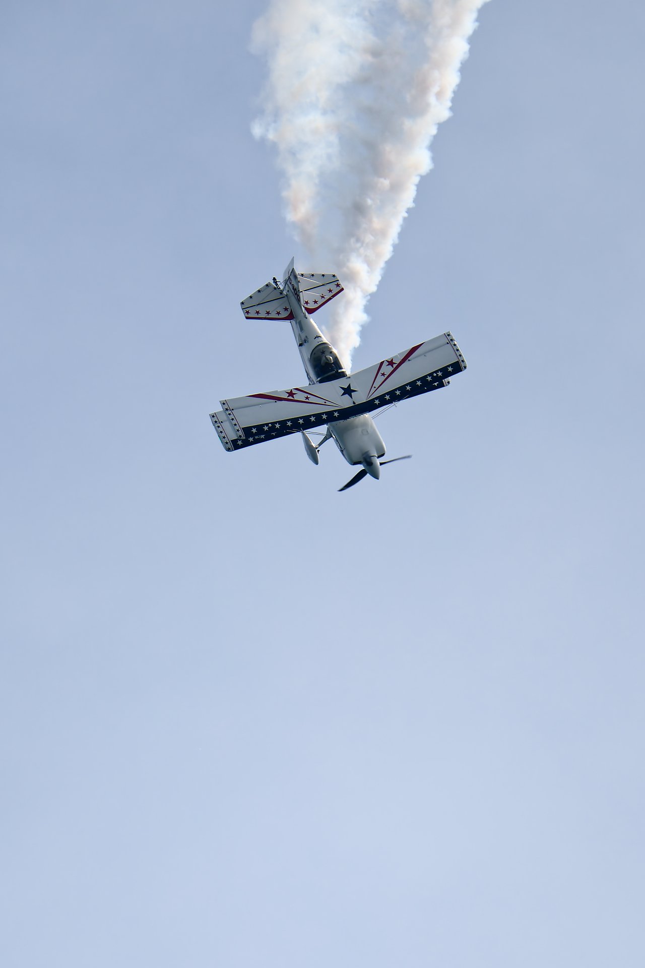 Czerwono-granatowy akrobata to Aviat Pitts S-2C, licencyjny wariant Curtissa Pitts S-2. Tu więcej informacji https://pl.wikipedia.org/wiki/Pitts_Special Fantastyczne zdjęcia, podczas tych figur pilot musi znosić niewąskie przeciążenia.