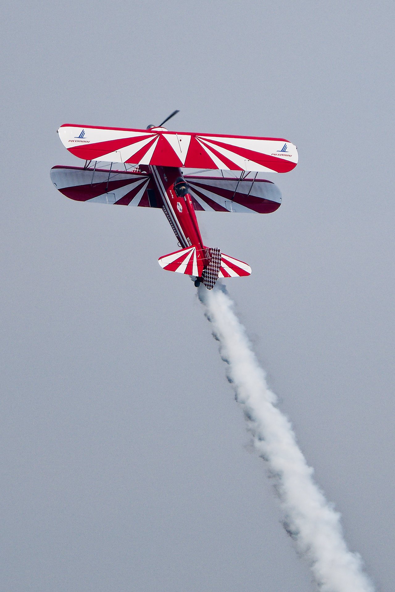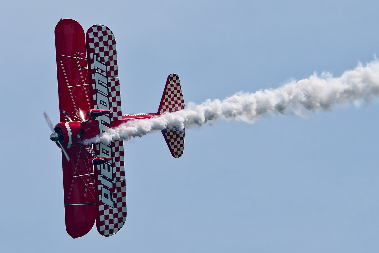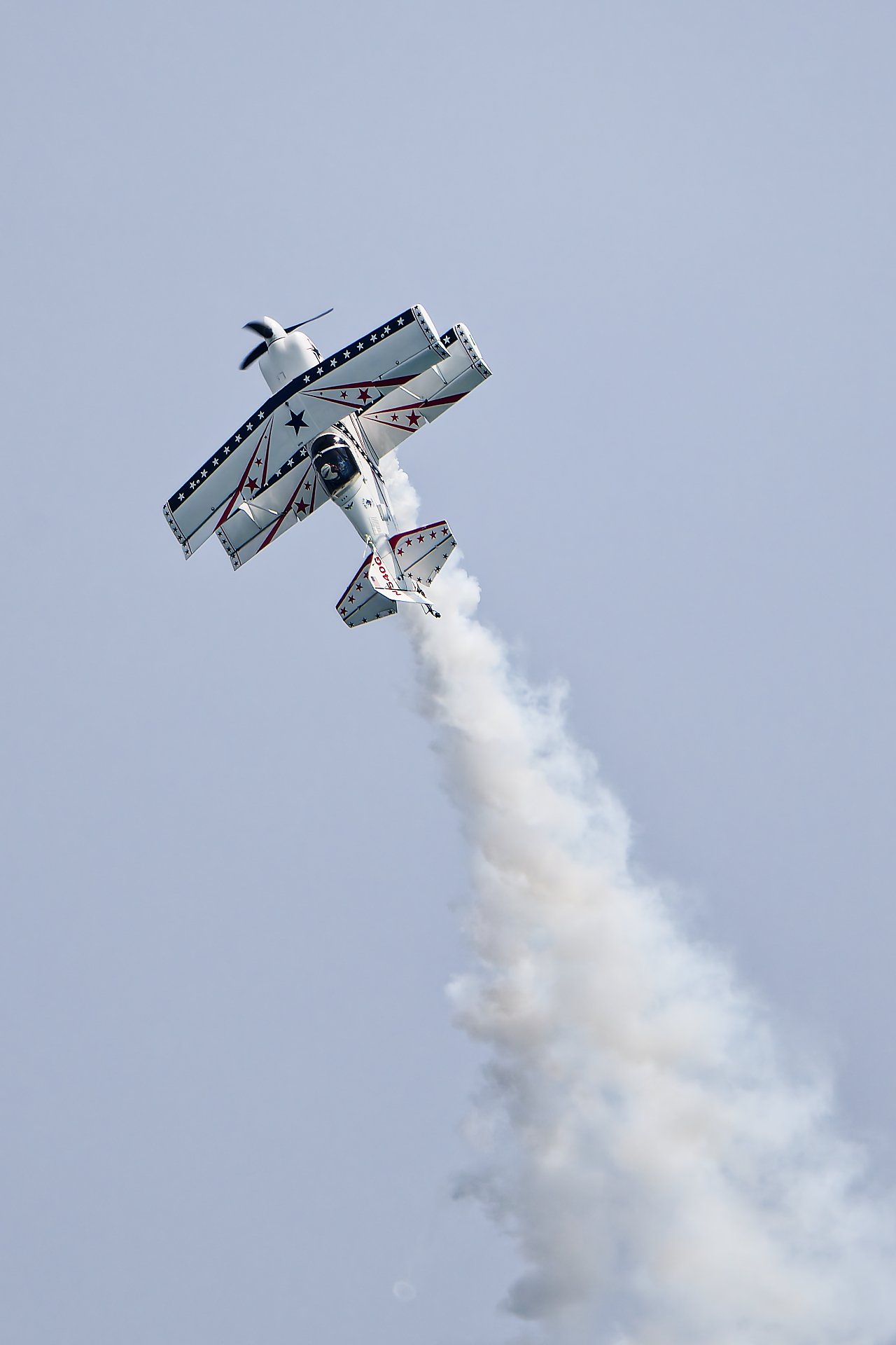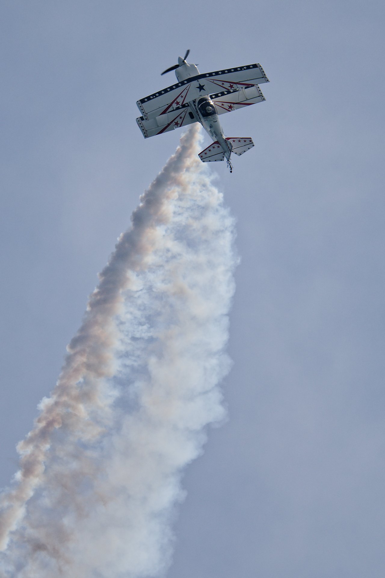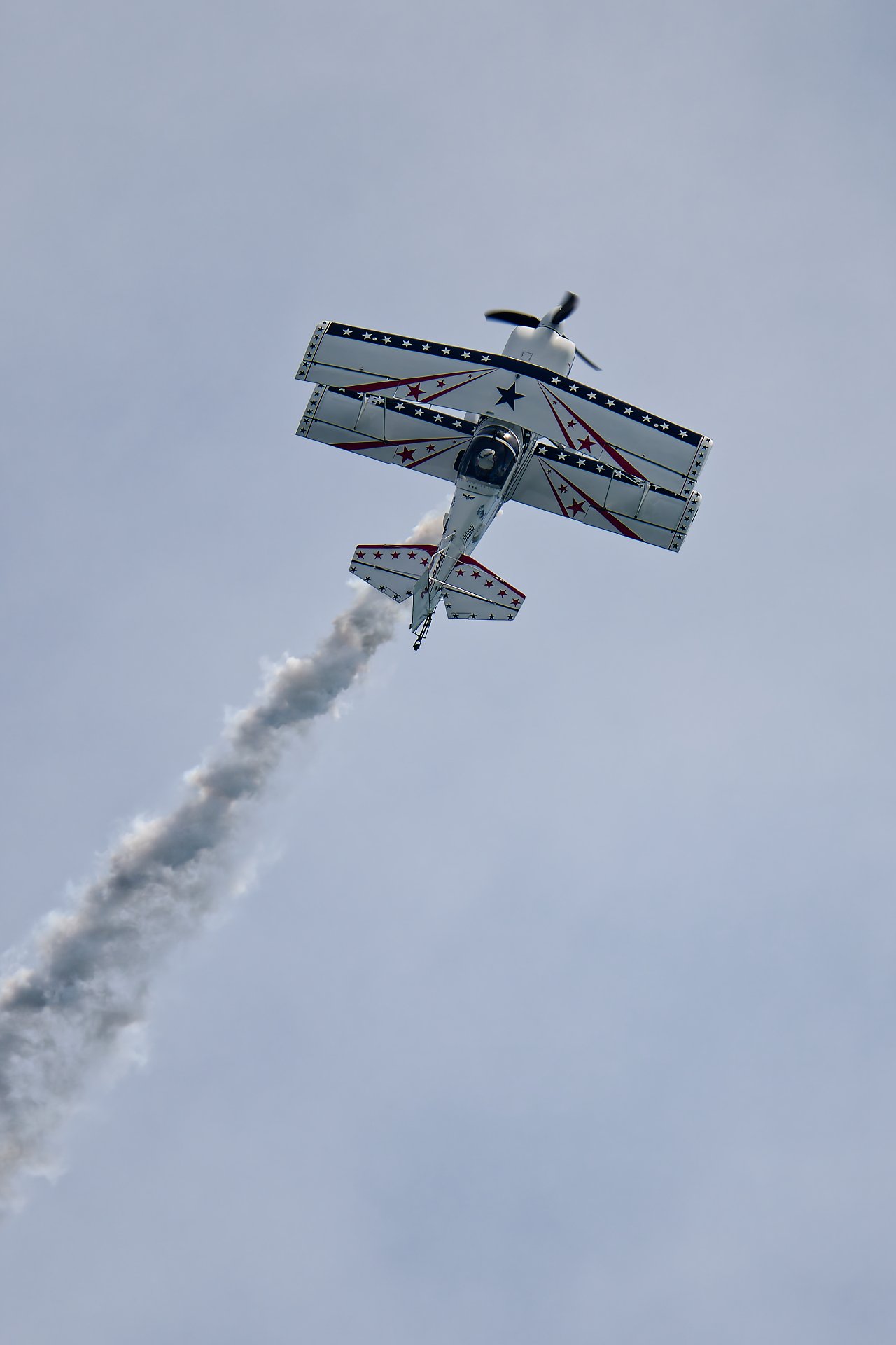Czerwono-granatowy akrobata to Aviat Pitts S-2C, licencyjny wariant Curtissa Pitts S-2. Tu więcej informacji https://pl.wikipedia.org/wiki/Pitts_Special Fantastyczne zdjęcia, podczas tych figur pilot musi znosić niewąskie przeciążenia.