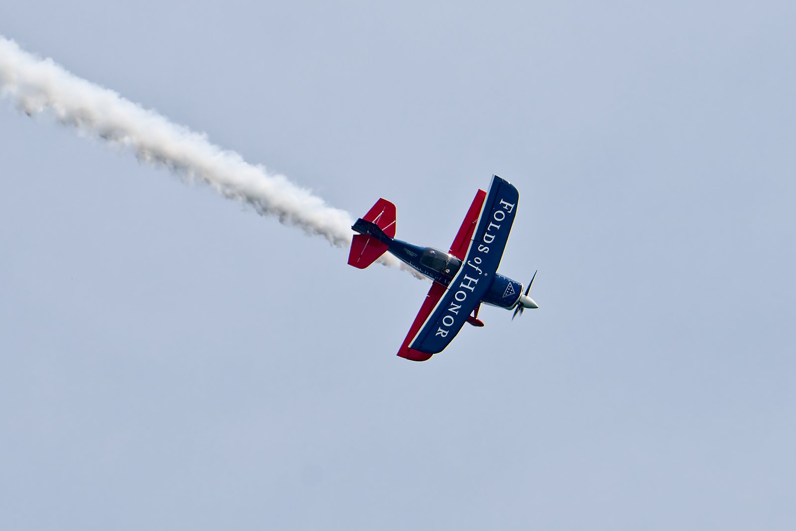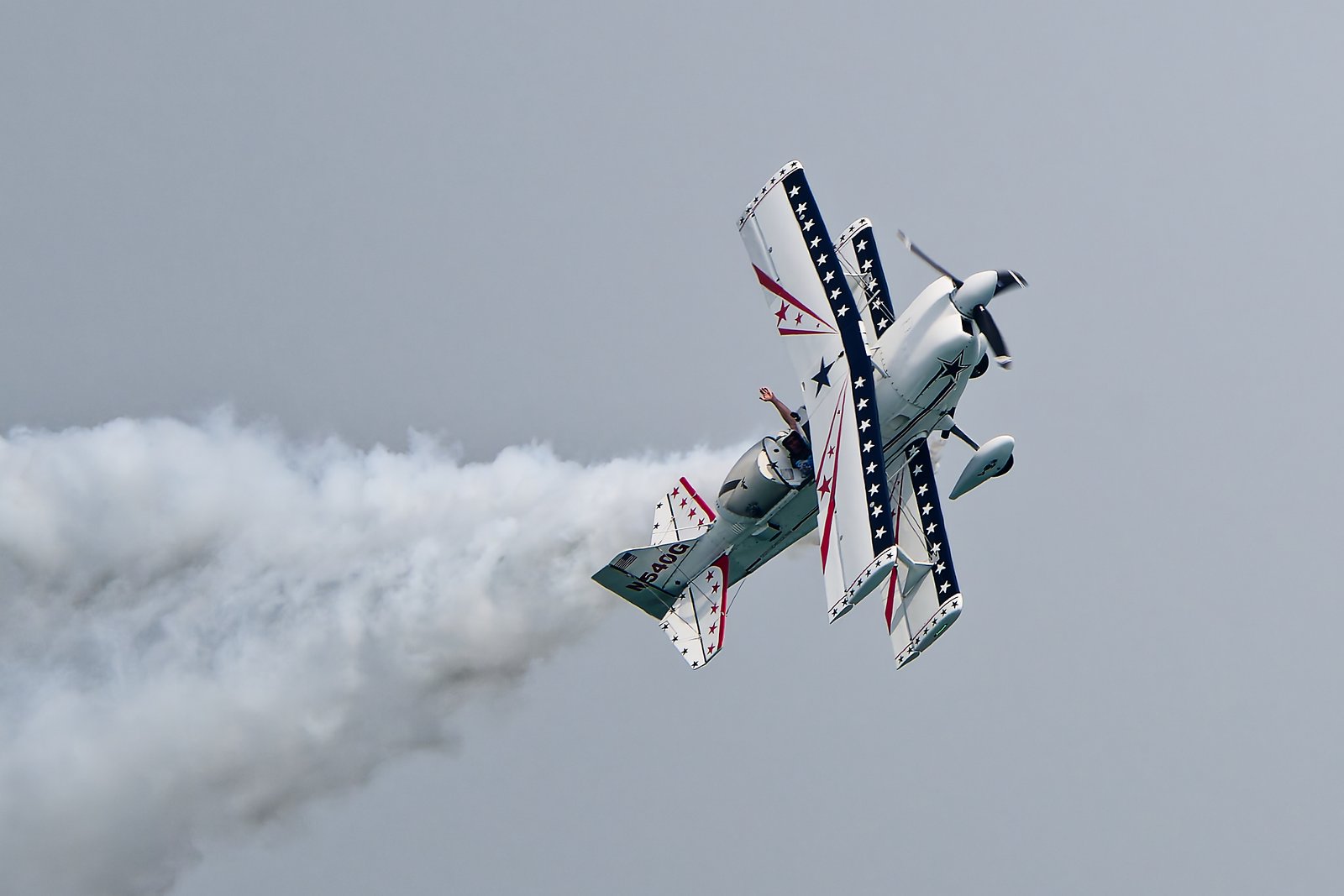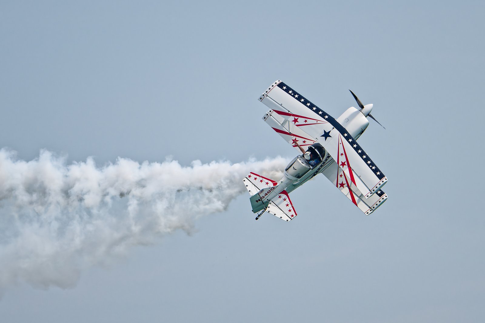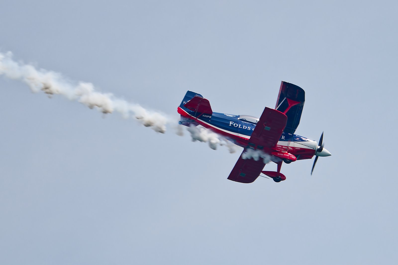 Czerwono-granatowy akrobata to Aviat Pitts S-2C, licencyjny wariant Curtissa Pitts S-2. Tu więcej informacji https://pl.wikipedia.org/wiki/Pitts_Special Fantastyczne zdjęcia, podczas tych figur pilot musi znosić niewąskie przeciążenia.