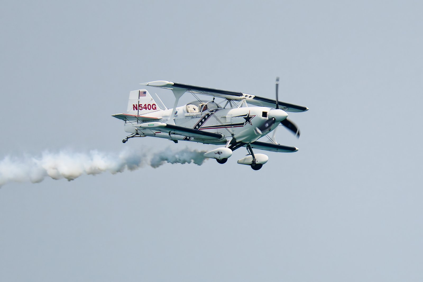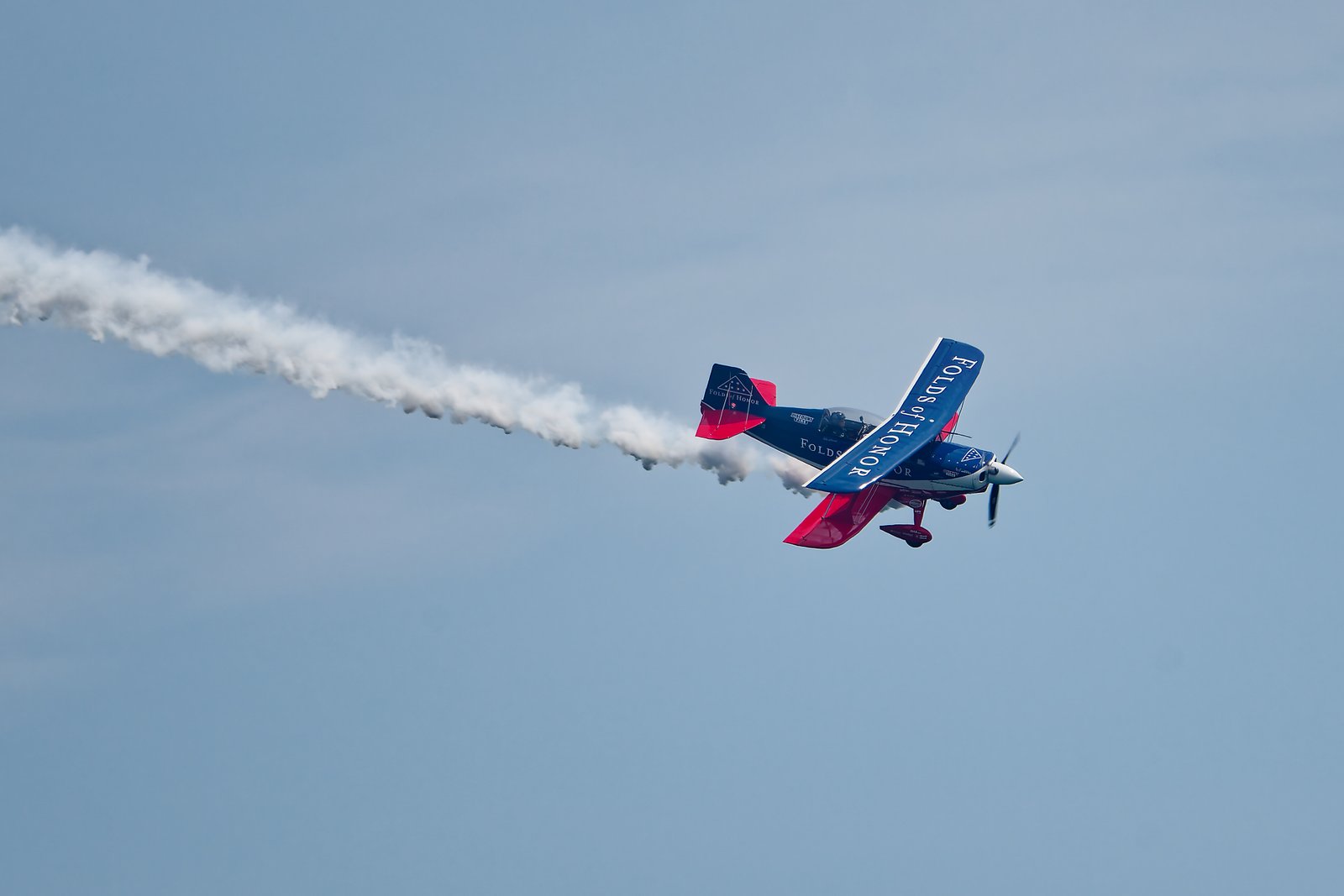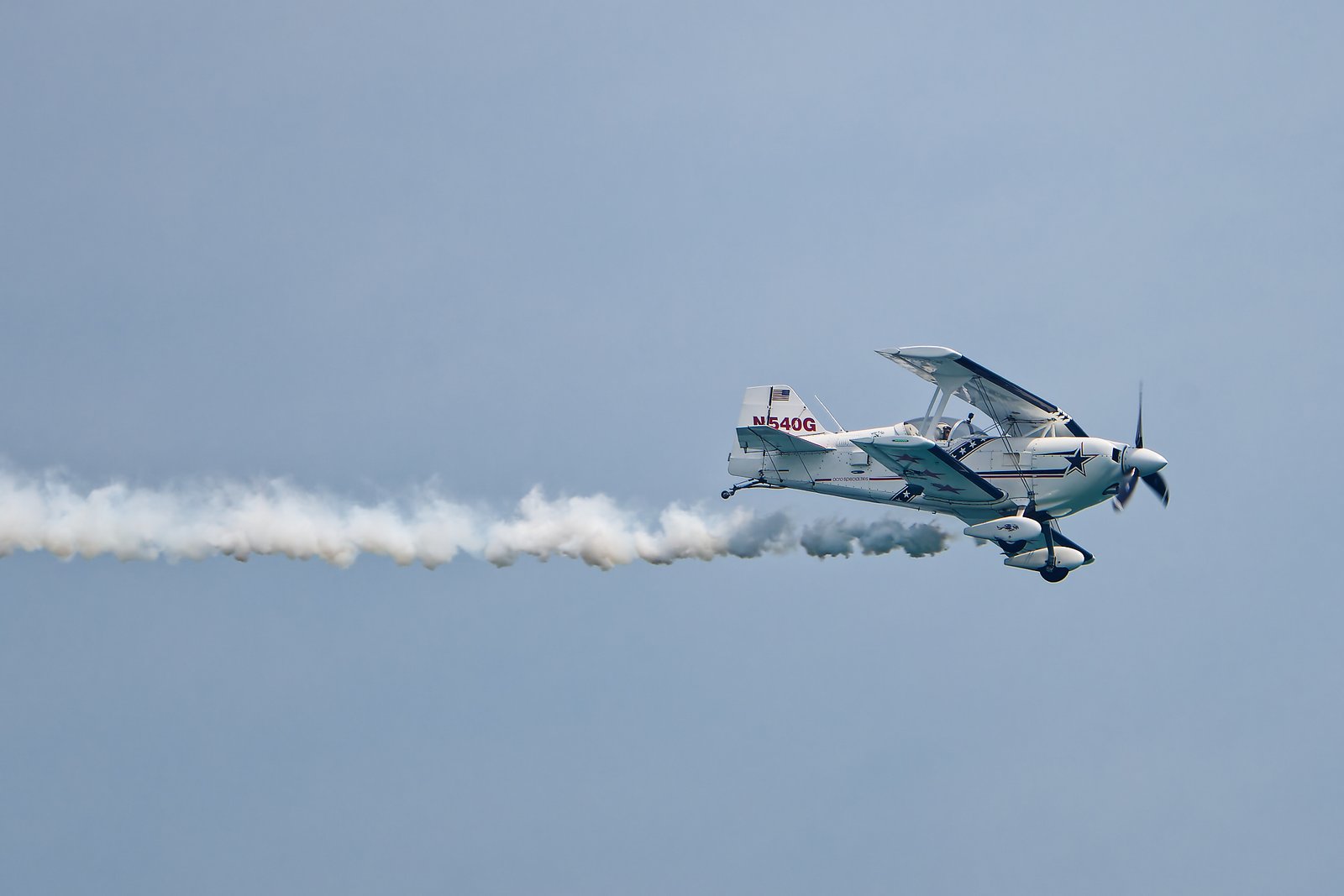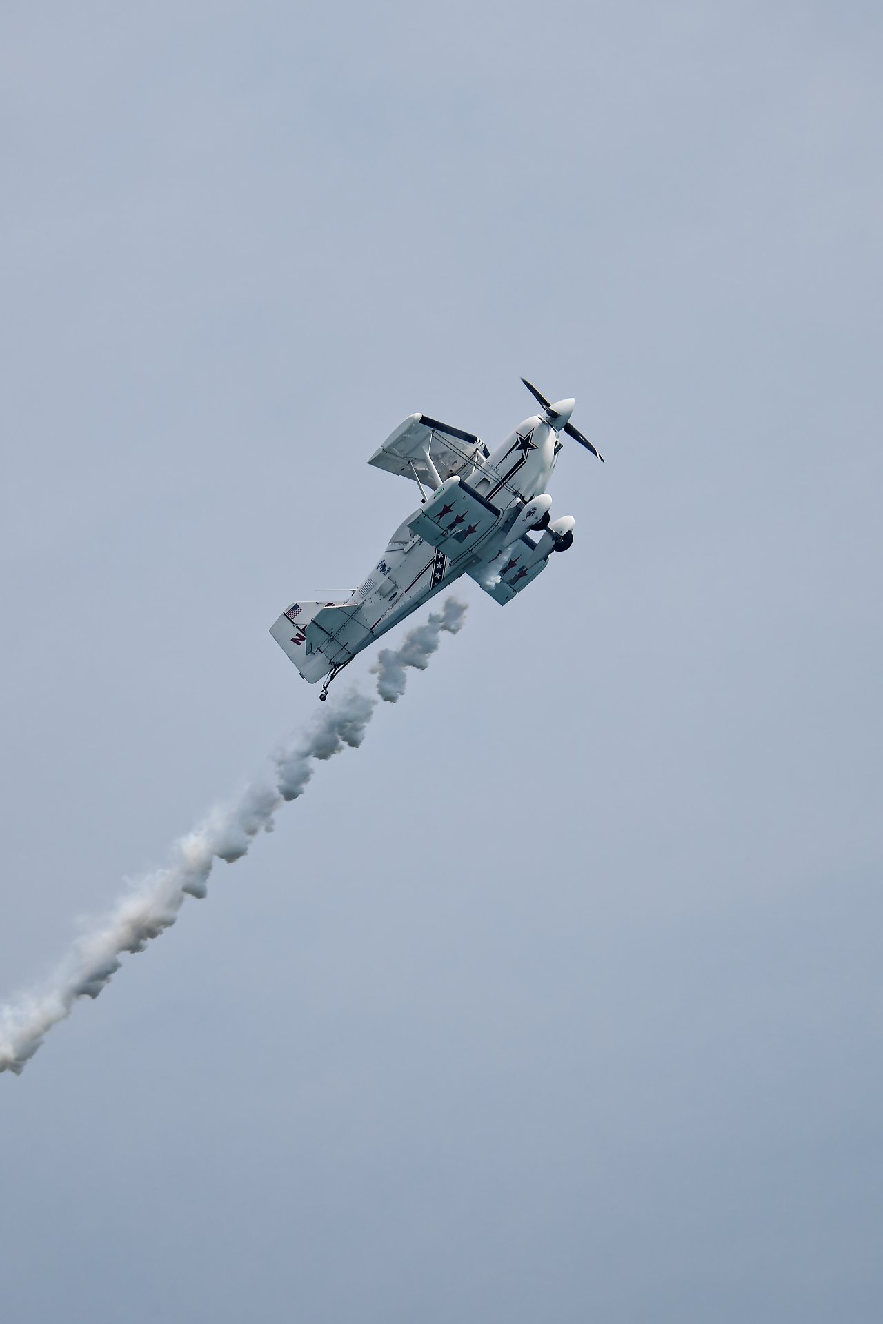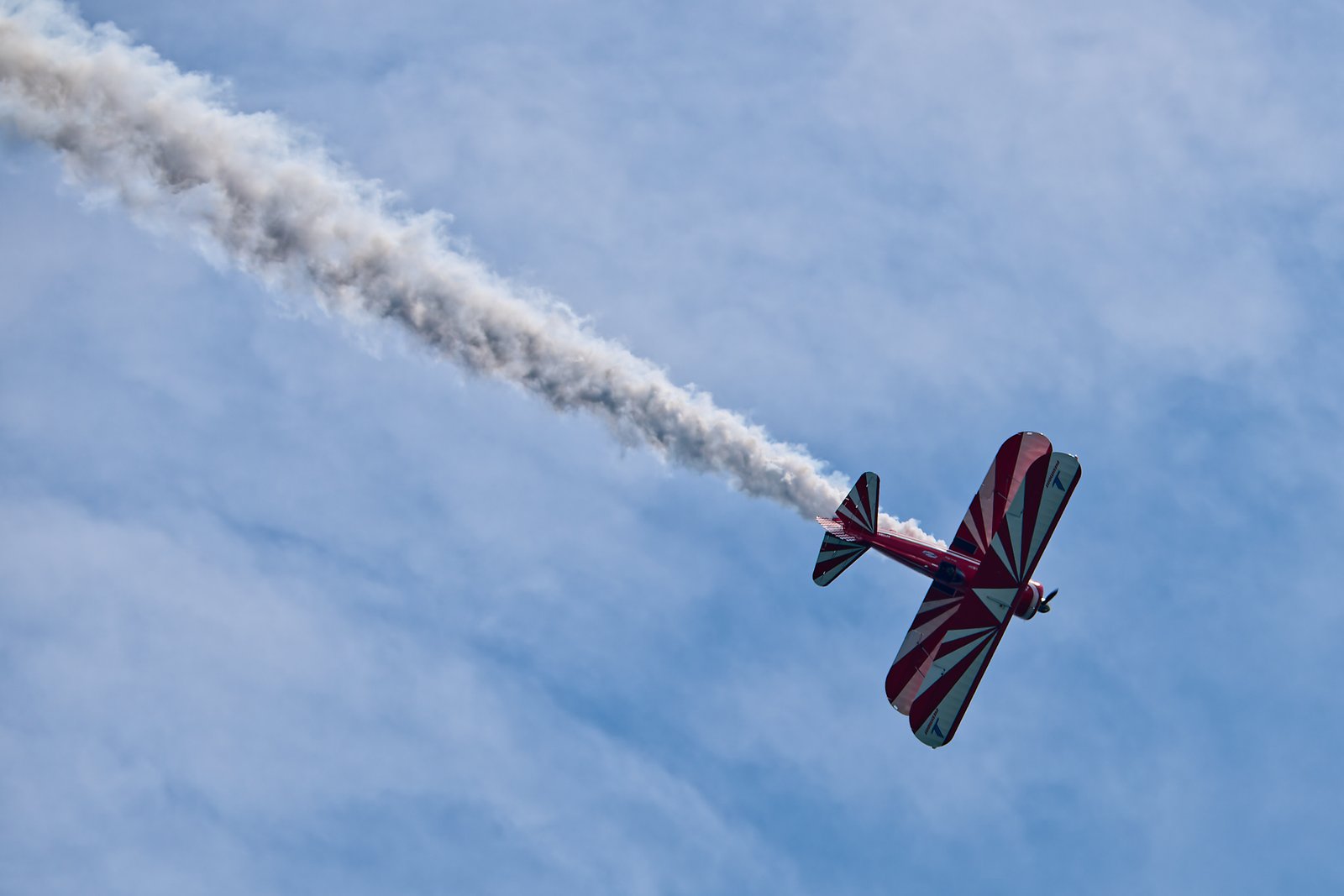 Czerwono-granatowy akrobata to Aviat Pitts S-2C, licencyjny wariant Curtissa Pitts S-2. Tu więcej informacji https://pl.wikipedia.org/wiki/Pitts_Special Fantastyczne zdjęcia, podczas tych figur pilot musi znosić niewąskie przeciążenia.