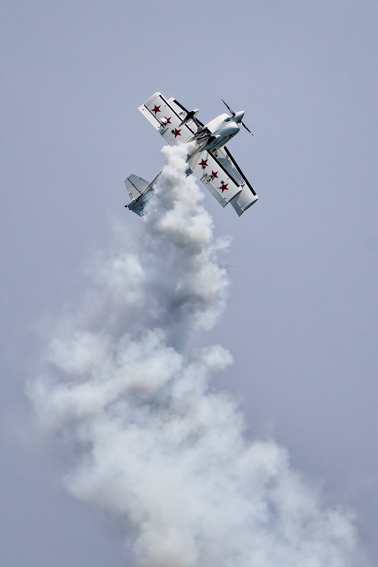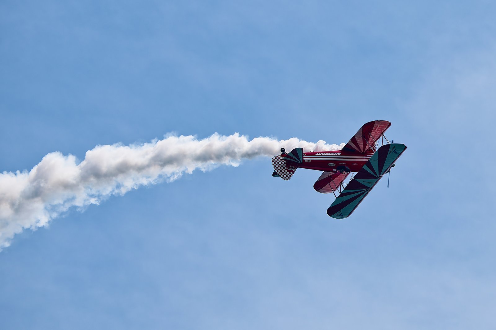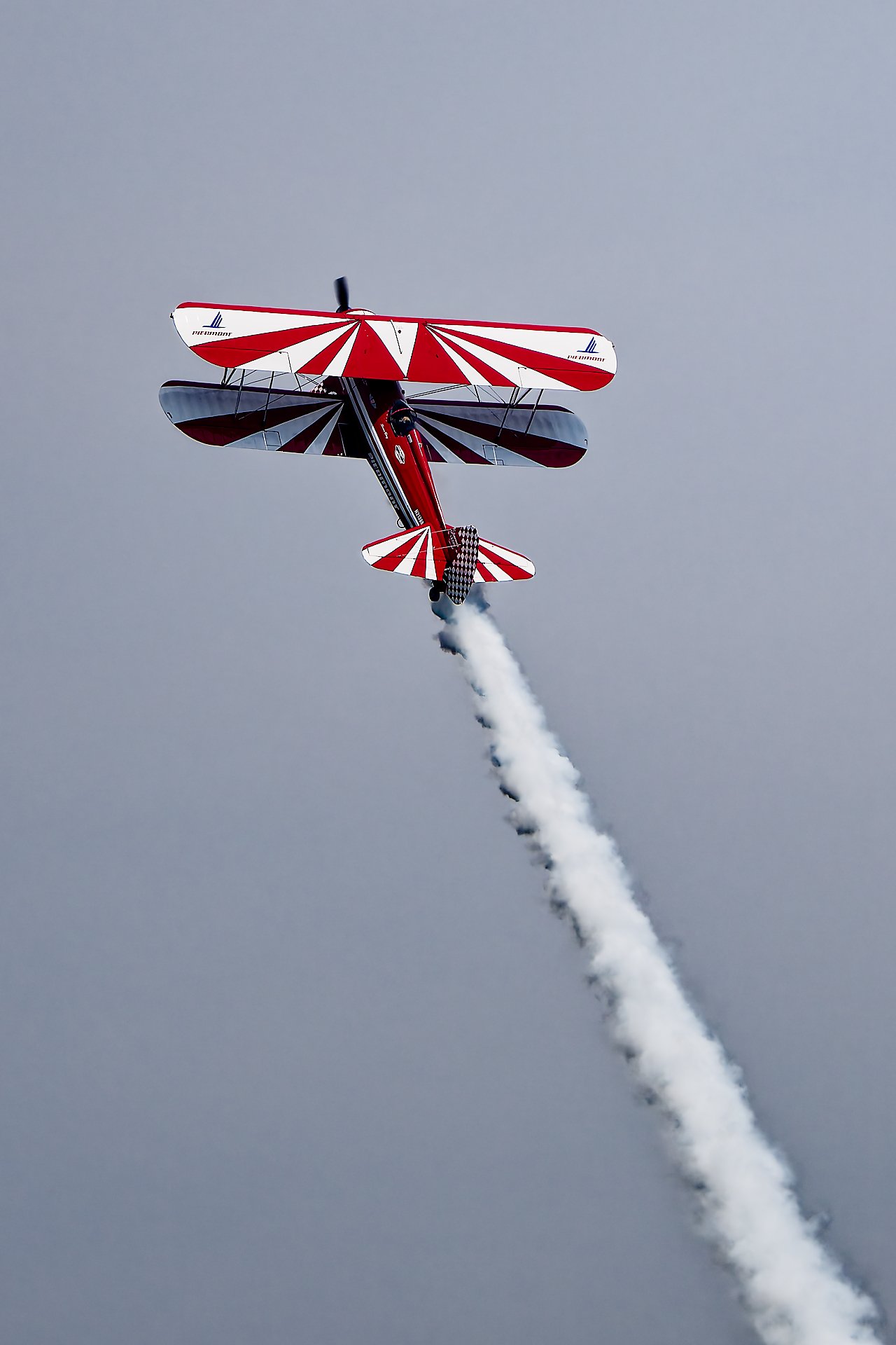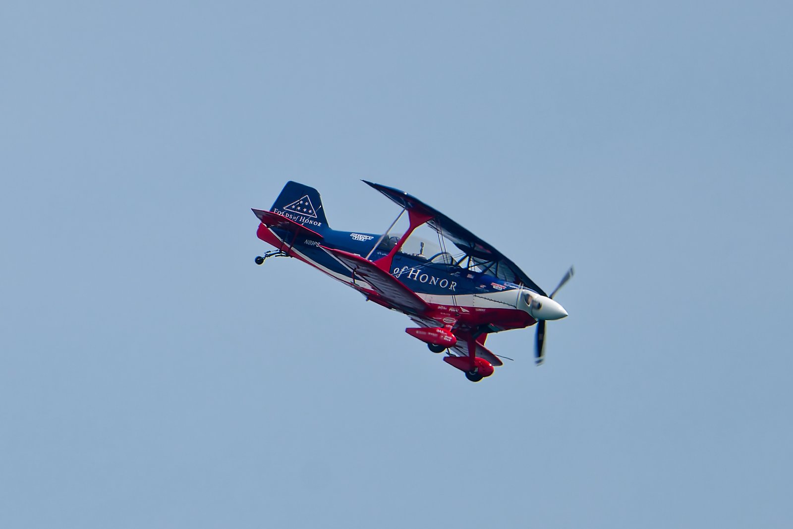 Czerwono-granatowy akrobata to Aviat Pitts S-2C, licencyjny wariant Curtissa Pitts S-2. Tu więcej informacji https://pl.wikipedia.org/wiki/Pitts_Special Fantastyczne zdjęcia, podczas tych figur pilot musi znosić niewąskie przeciążenia.