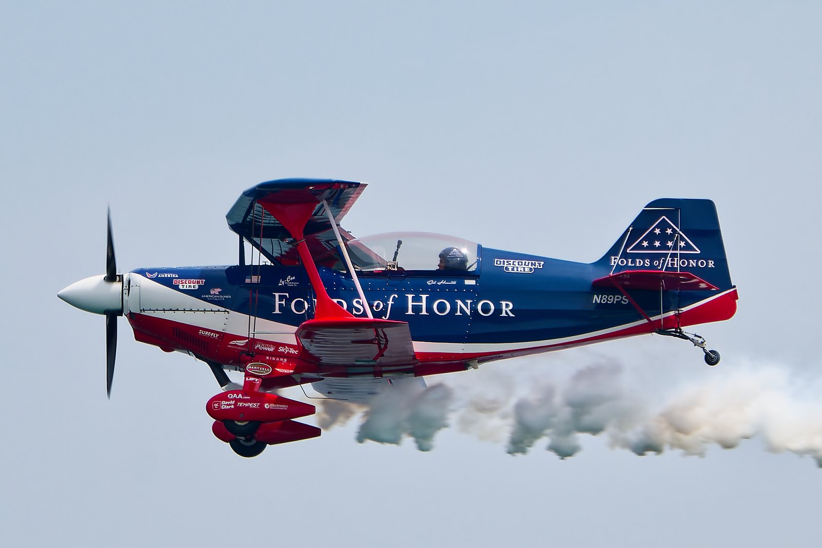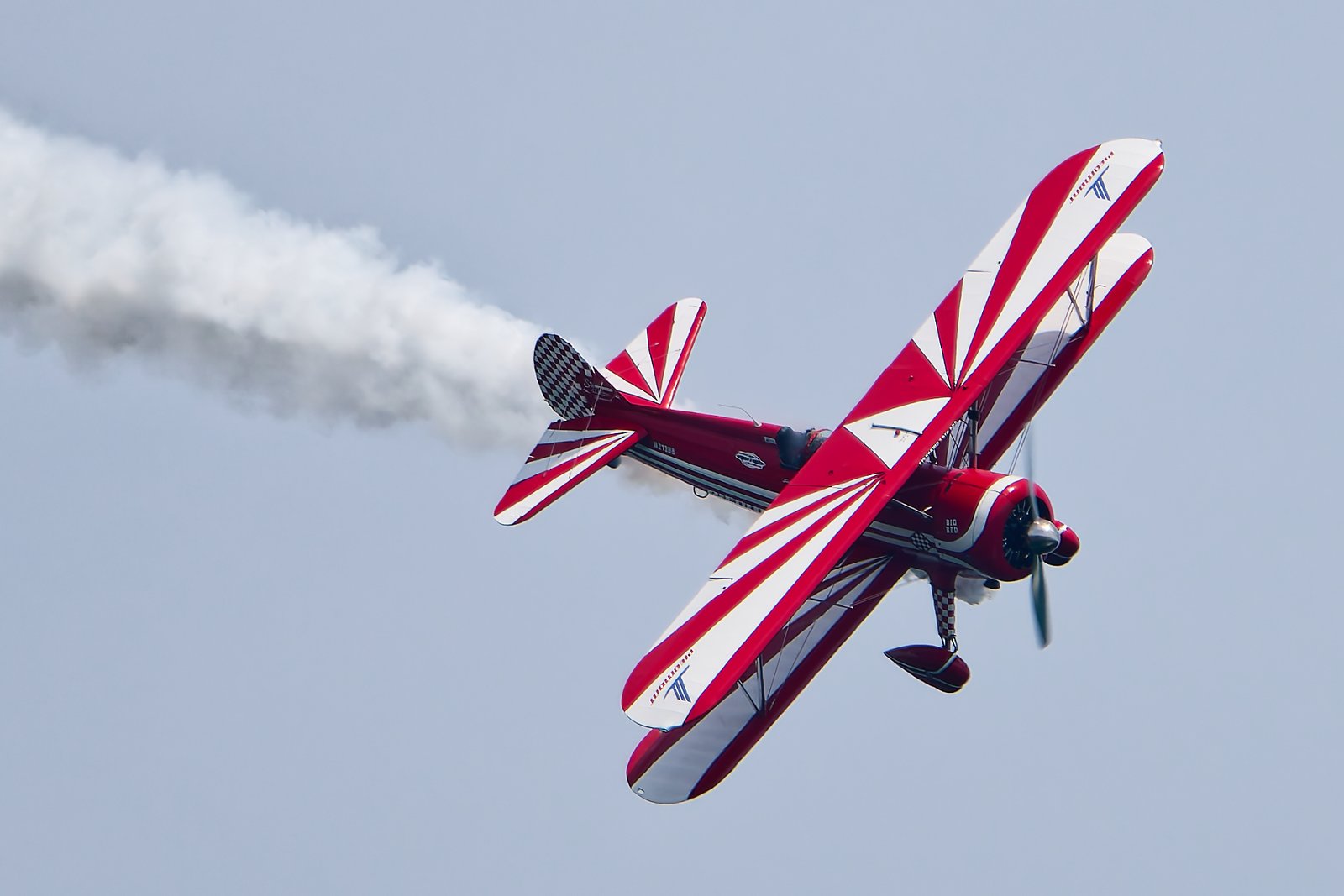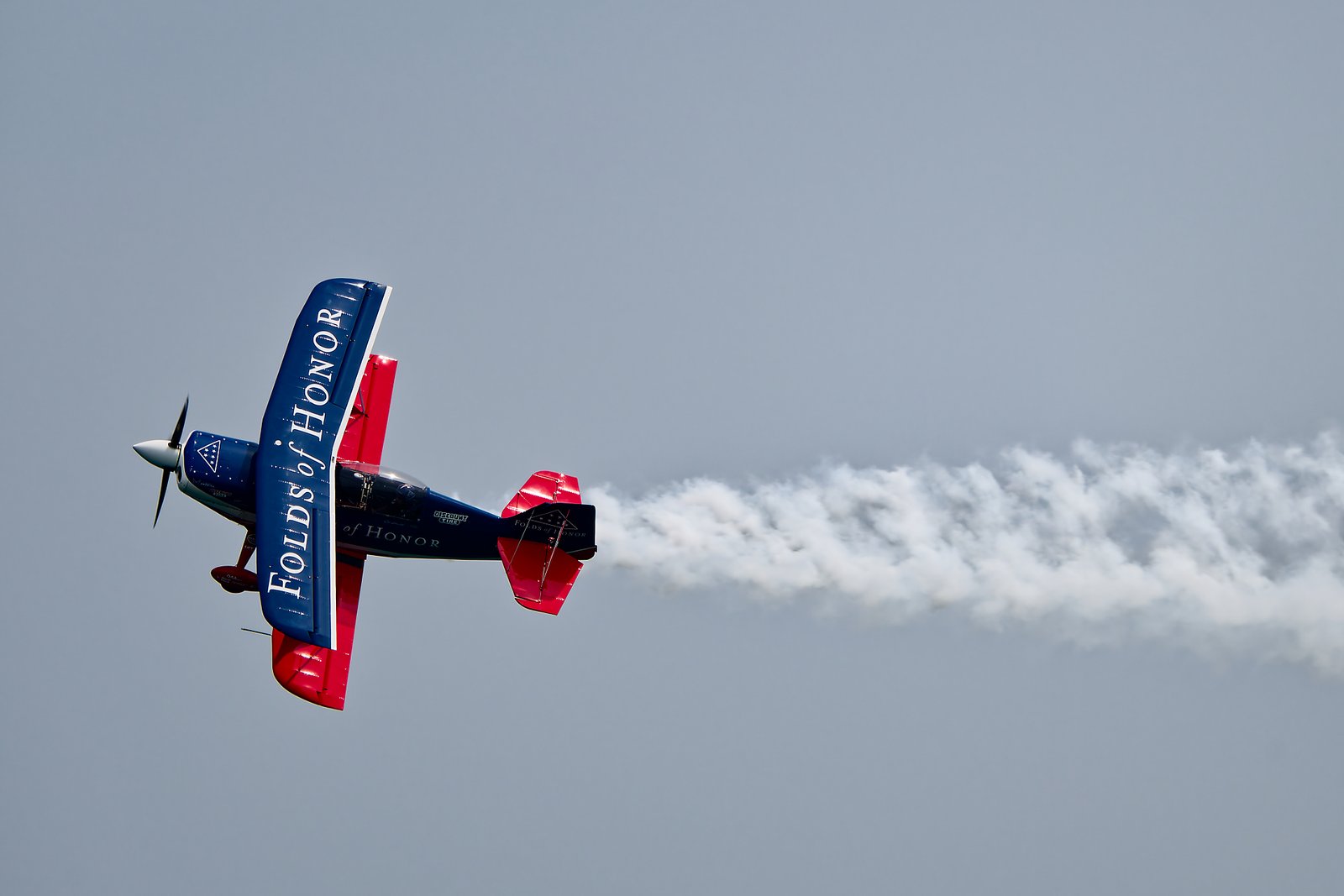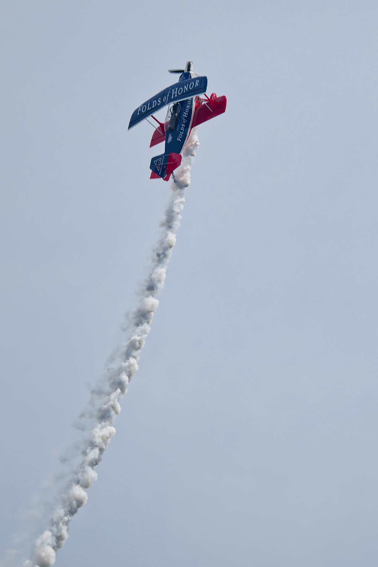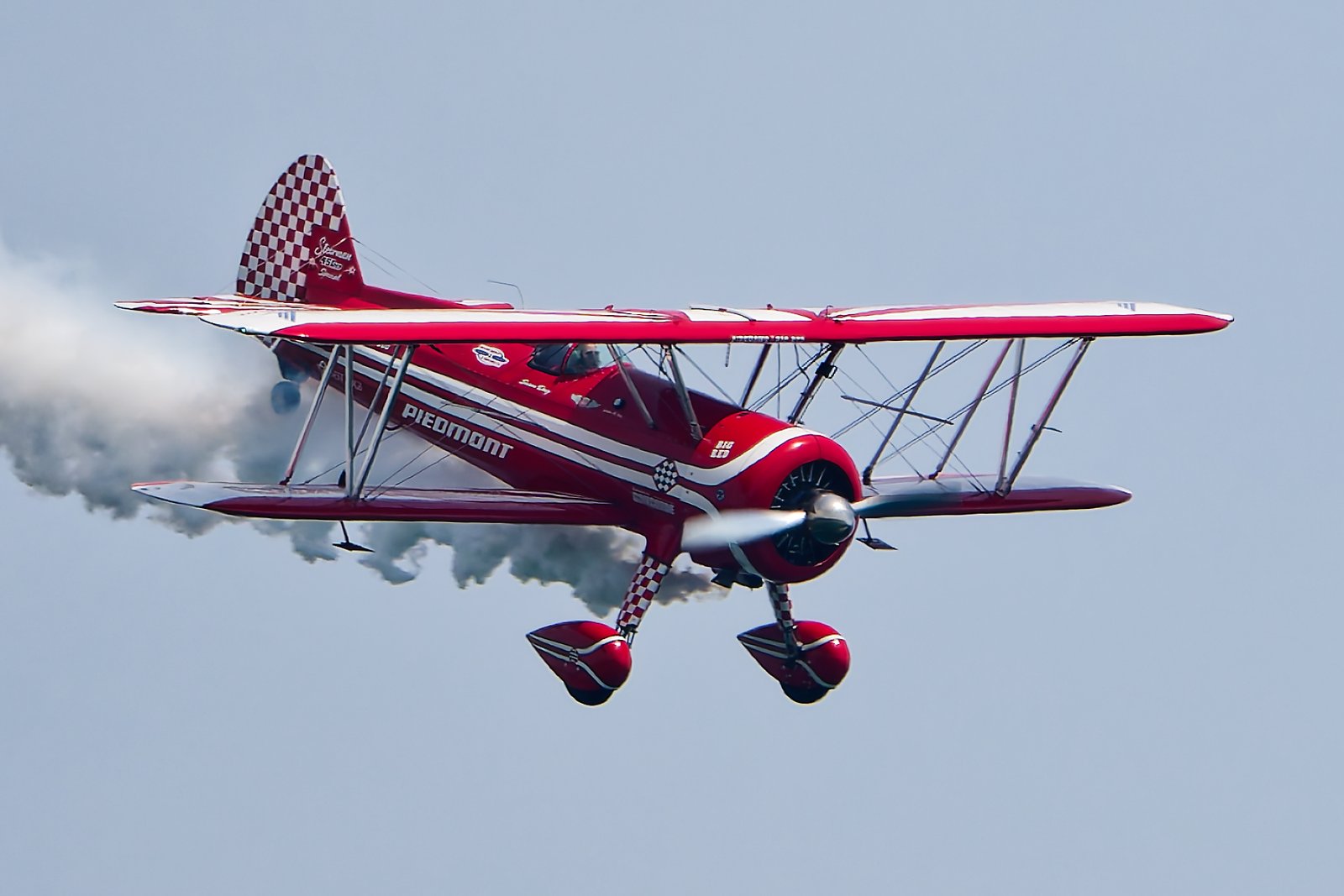 Czerwono-granatowy akrobata to Aviat Pitts S-2C, licencyjny wariant Curtissa Pitts S-2. Tu więcej informacji https://pl.wikipedia.org/wiki/Pitts_Special Fantastyczne zdjęcia, podczas tych figur pilot musi znosić niewąskie przeciążenia.