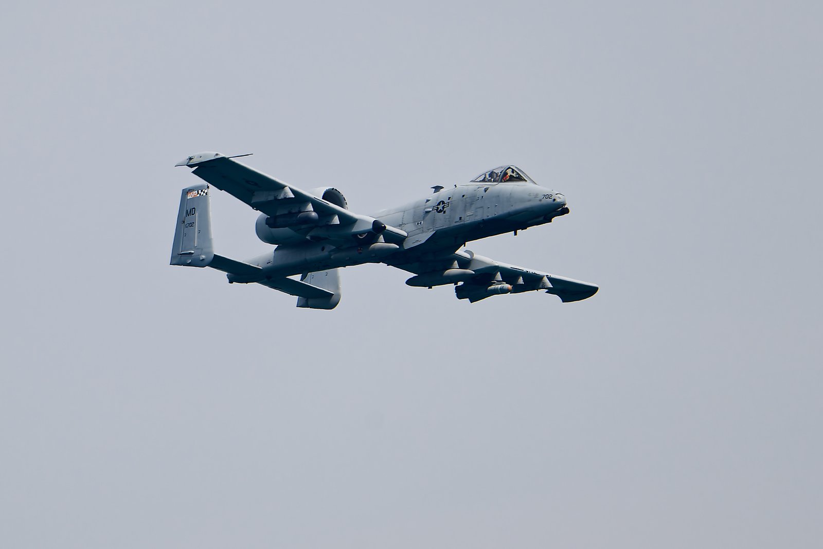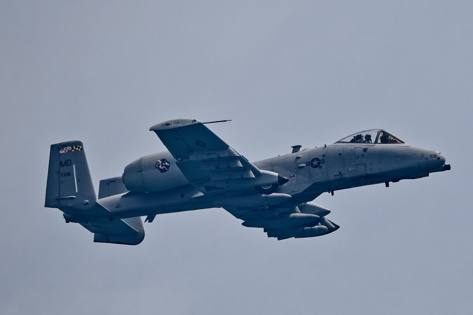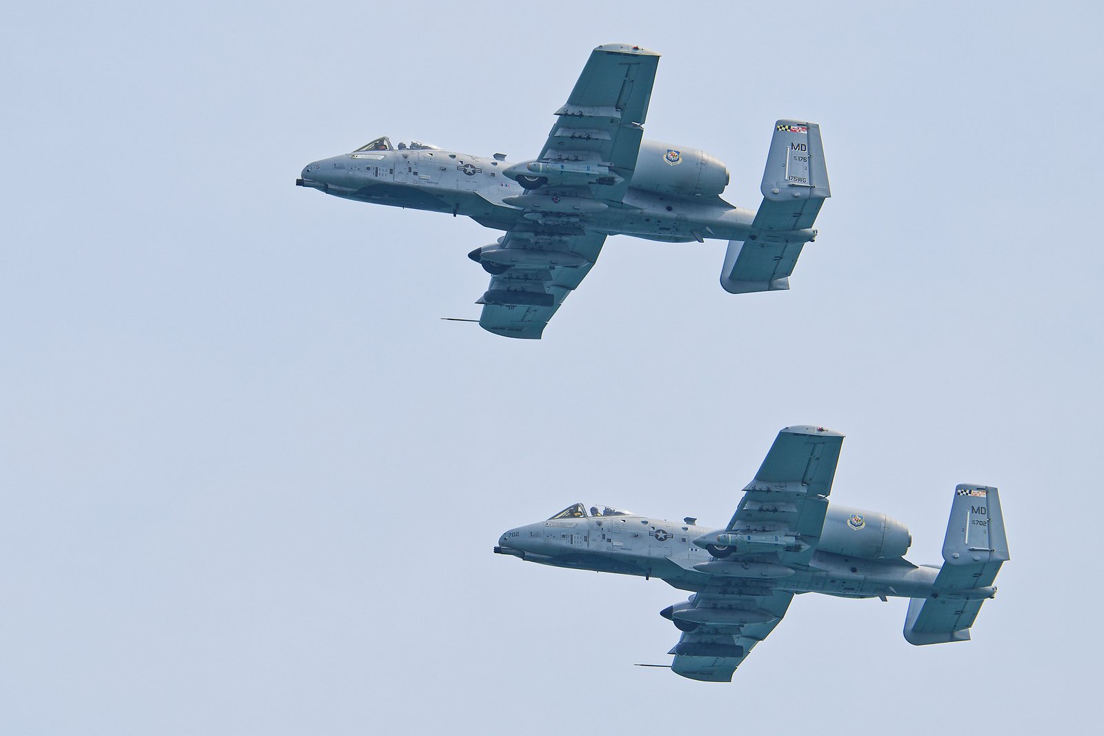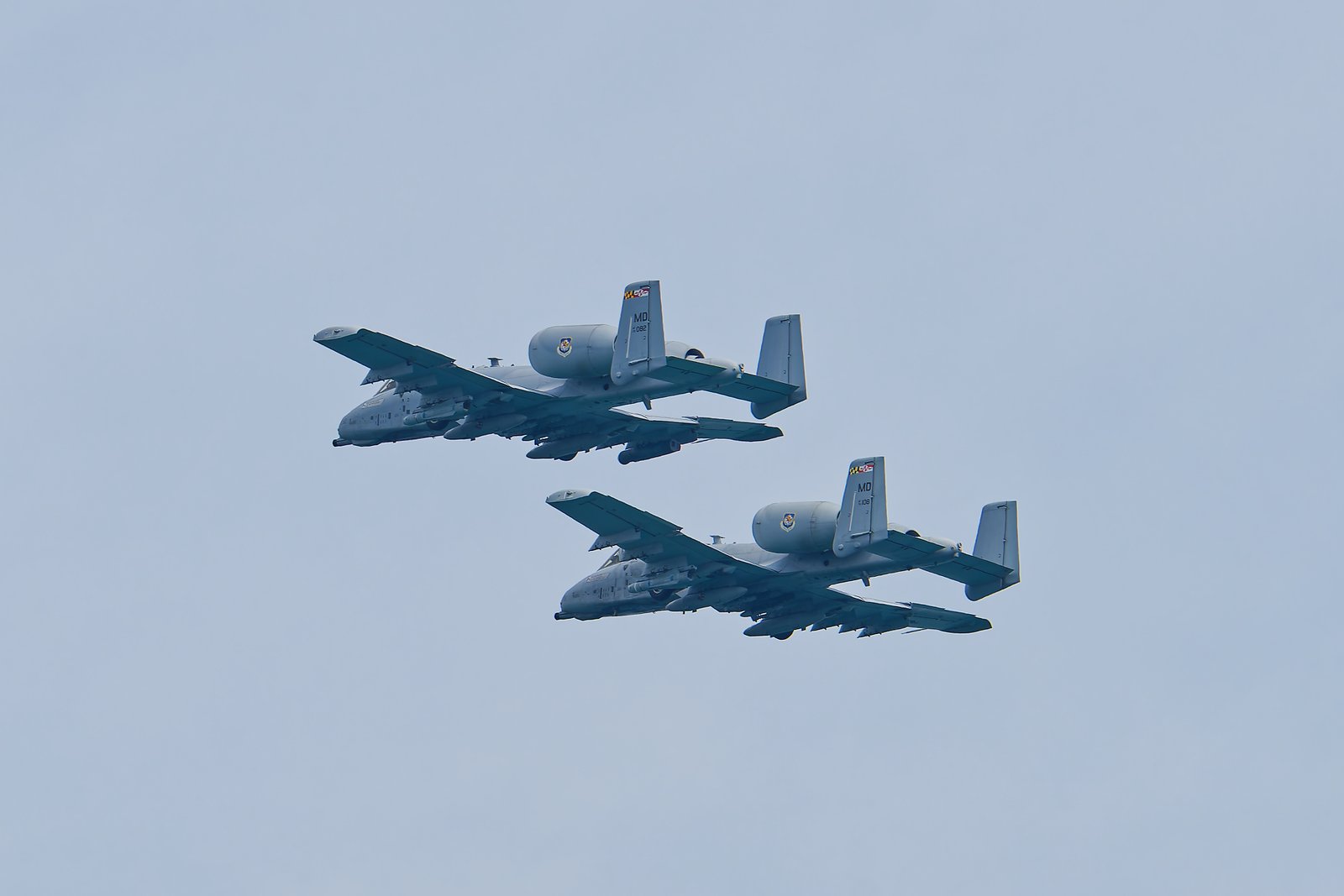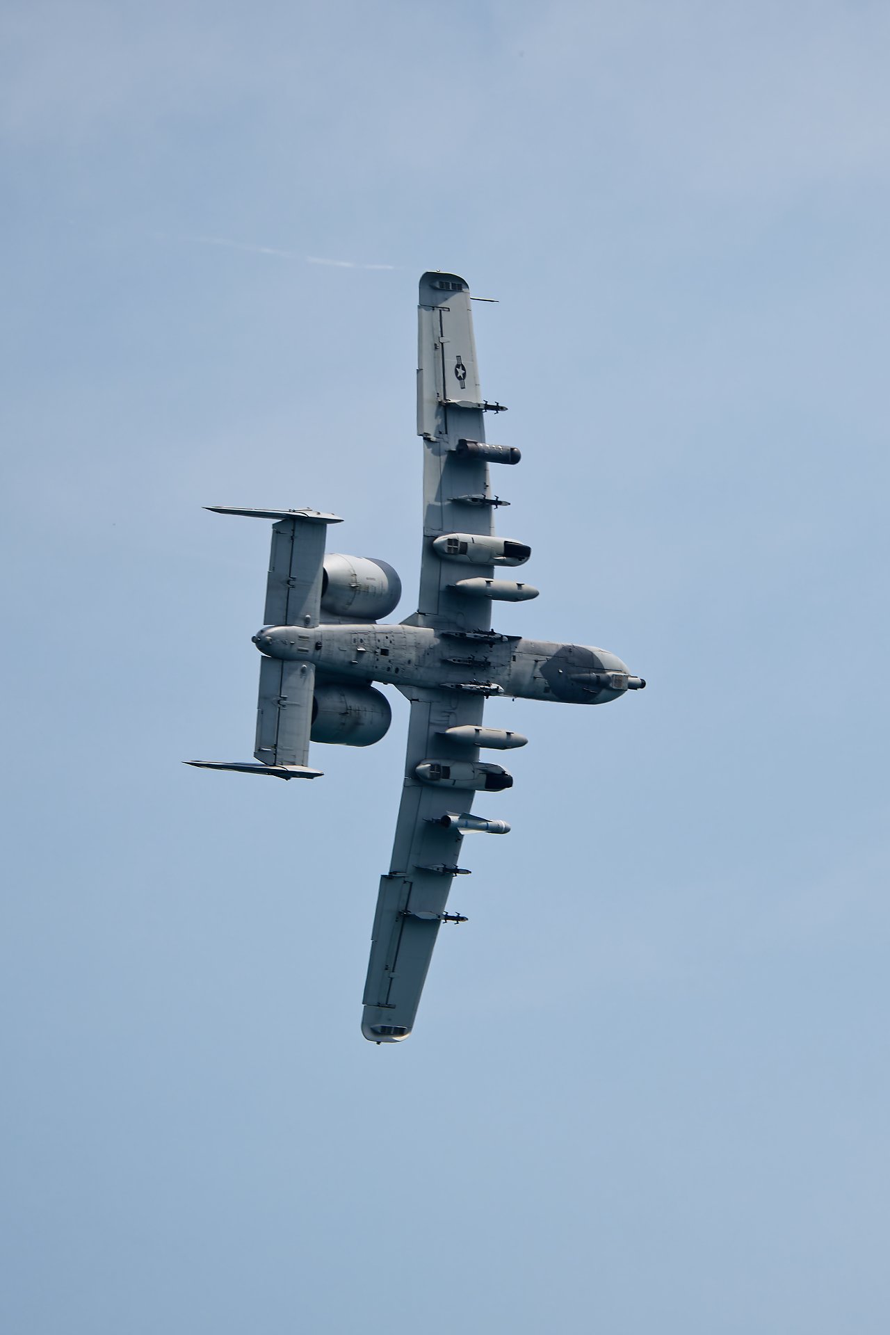 Samolot, który podpisałeś jako ciężkie ruszenie, to mój ulubiony model z amerykańskiego lotnictwa szturmowego, Fairchild Republic A-10 II Thunderbolt, zwany również „Warthog” (czyli Guziec), specjalnie zaprojektowany tak, żeby wytrzymać ciężki ostrzał z ziemi, a na pokładzie ma jedno z najcięższych działek w tego typu samolotach, siedmiolufowe obrotowe GAU-8 Avenger kalibru 30 mm, potężnie szybkostrzelne, robi sieczkę z czołgów i innych pojazdów opancerzonych. Plus przenosi imponującą ilość uzbrojenia pod skrzydłami (co zresztą częściowo widać na Twoich zdjęciach). Z tego, co pamiętam, obecnie lata na nich (jeszcze) Gwardia Narodowa, a z oznaczeń na statecznikach pionowych wynika, że to samoloty 175 skrzydła tejże Gwardii z bazy Warfield Air w Marylandzie.
