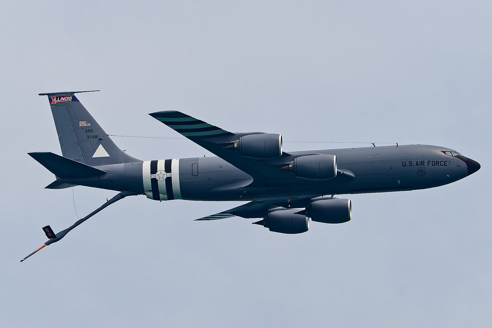 Powietrzna cysterna to Boeing KC-135 Stratotanker, wojskowa wersja Boeinga 707. Nie wiem, dlaczego na jednym zdjęciu ma podciągnięty bom do tankowania i wysunięte podwozie, jakby się zbierał do lądowania.