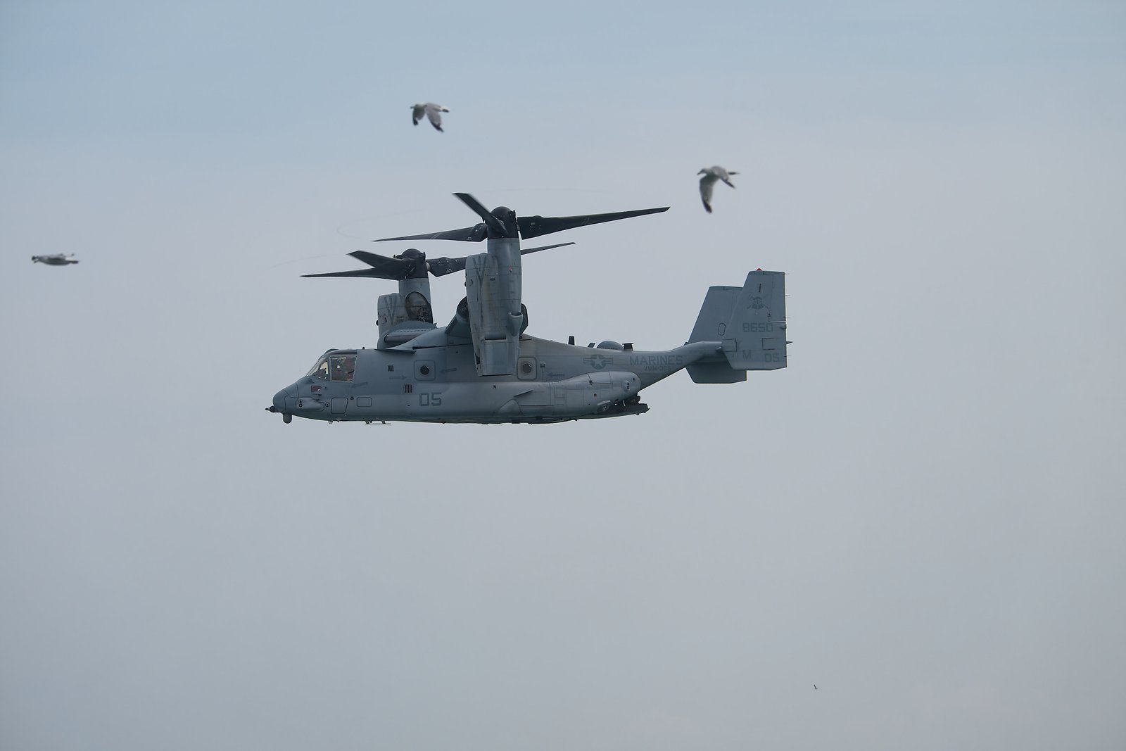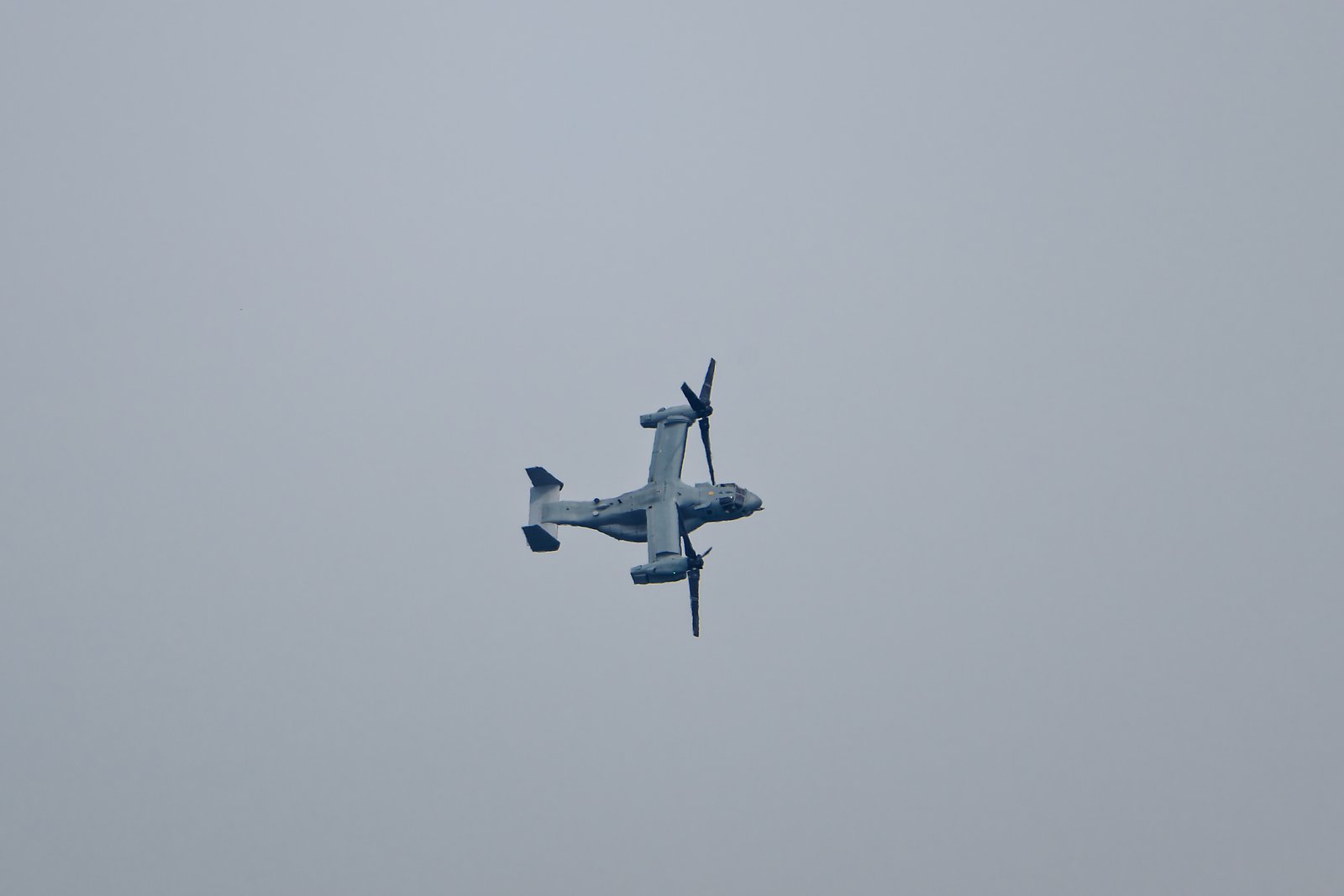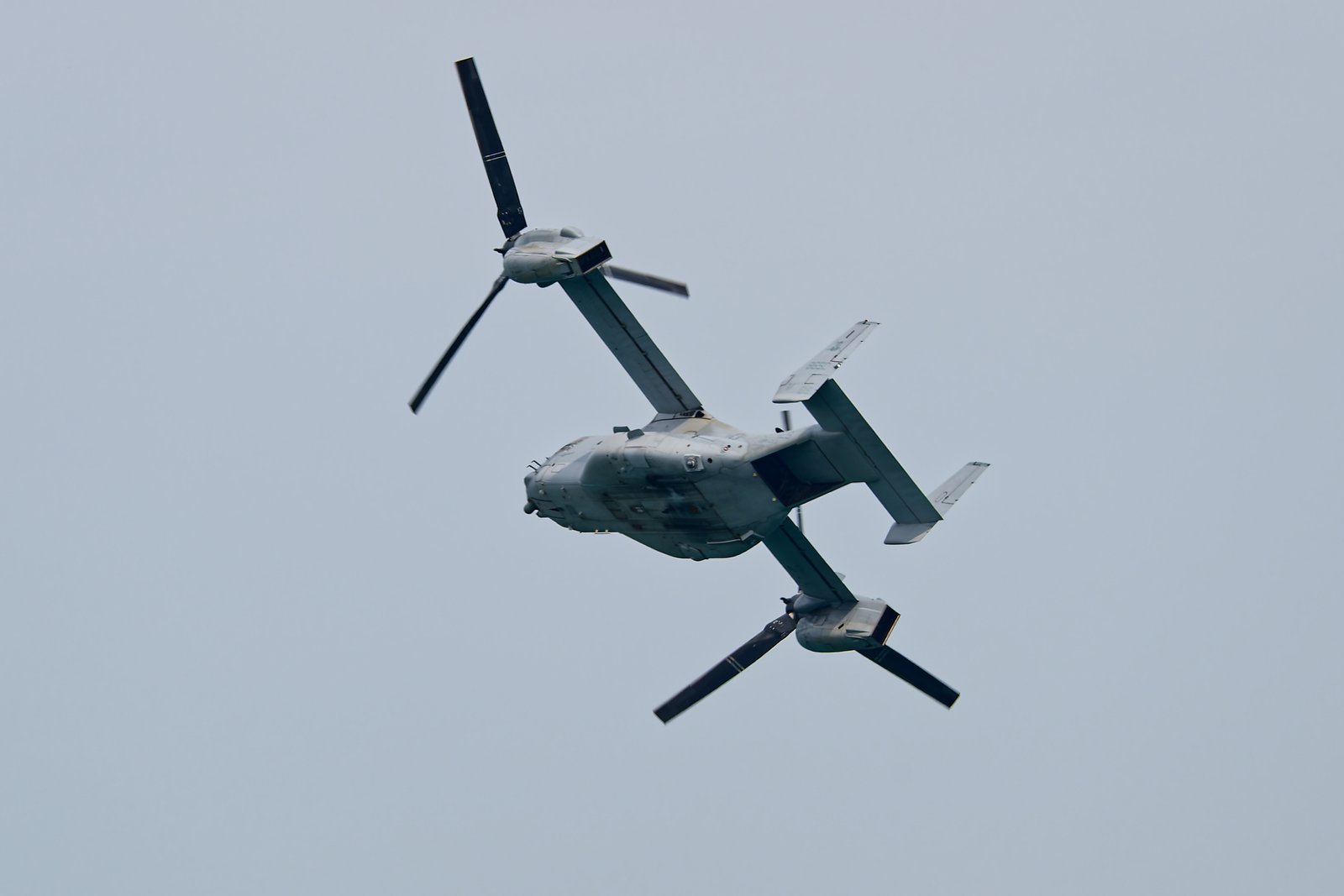 Pionowzlot to Bell Boeing V-22 Osprey, faktycznie, kombinacja helikoptera i samolotu, jak widać po oznaczeniach, używany przez marines. Dwa takie latały kiedyś na ćwiczeniach nad Gdynią, ale wysoko, nie robiły takiego zamieszania nad wodą ani nad plażą 🙂