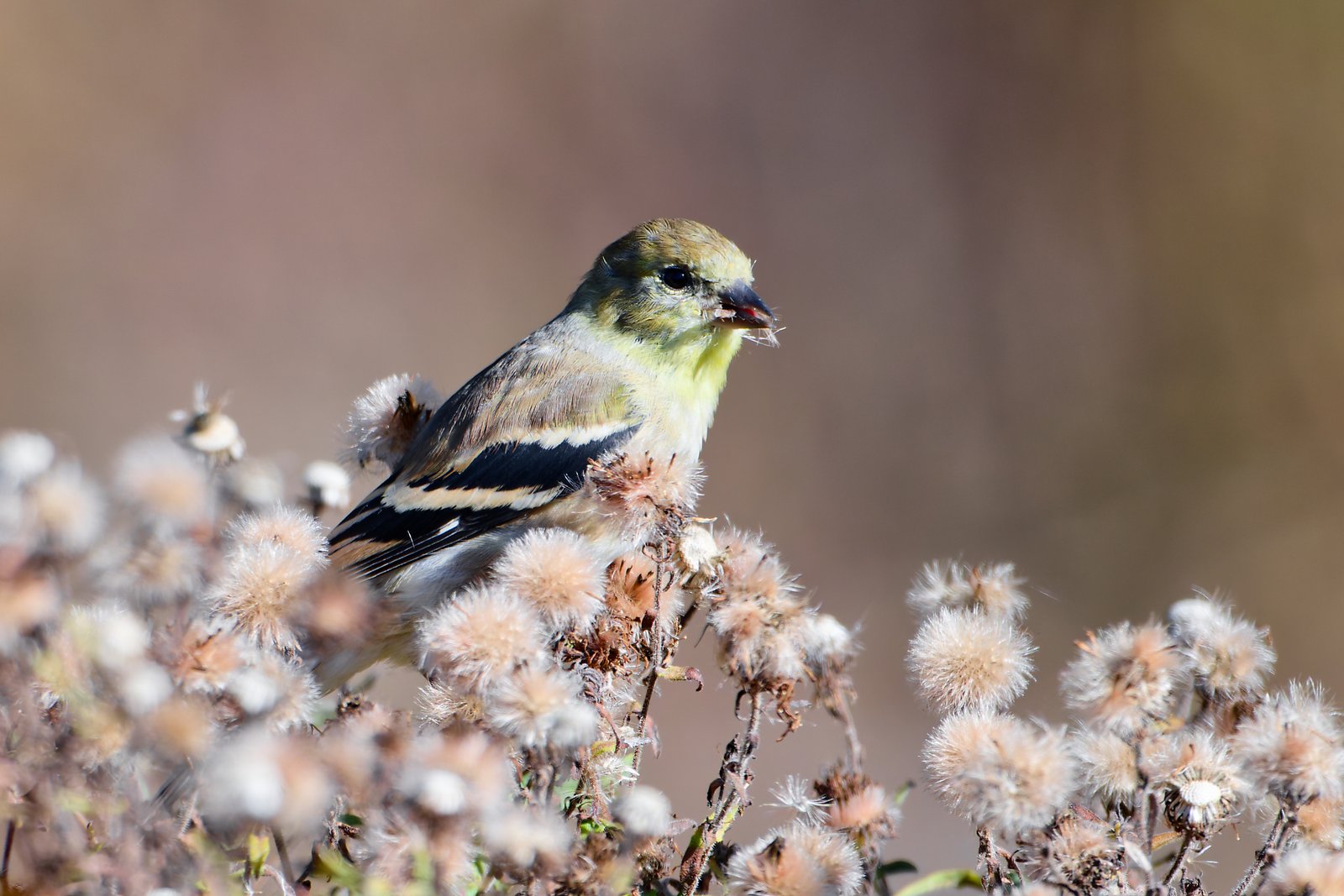 Samiczka czyża – puchata wśród kwiatowego puchu.