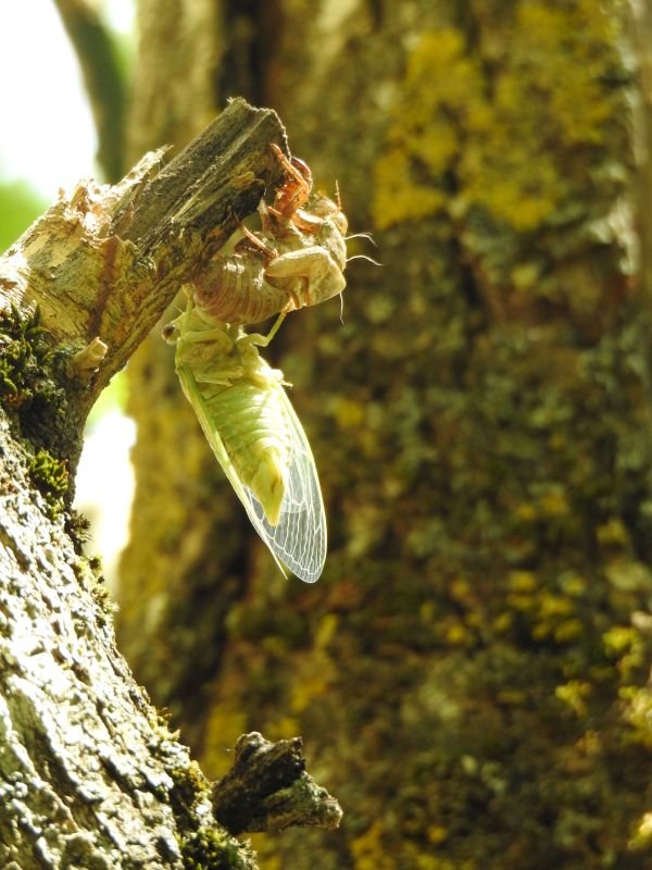 Cykada jest zielona, bo taka świeża, chyba z wiekiem (i dość szybko) brązowieją, w jednym z następnych zestawów będzie ładne zdjęcie, bo taka dorosła, brązowa usiadła na samochodzie.