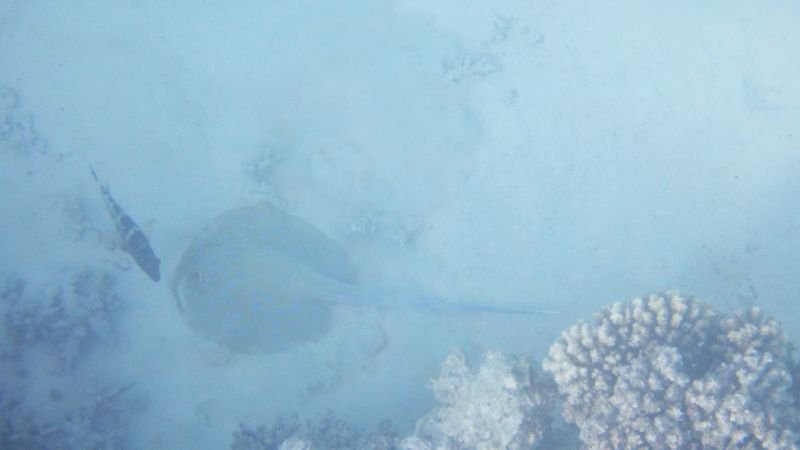 W każdym razie zdjęcie płaszczki vel patelnicy zrobiłem właśnie tak, dawszy nieco głębszego nurka. Mimo to światła było tyle, ile było, czyli nieprzesadnie dużo, a z fleszem nie robię, bo po pierwsze, nie chcę płoszyć ani oślepiać ryb (tym bardziej, że spłoszona płaszczka może zrobić krzywdę – na ogonie ma kolce z nieprzyjemnym dość jadem), a po drugie jak w wodzie unosi się plankton, to i tak by wziął na siebie większość flesza i na zdjęciu byłby efekt padającego śniegu.